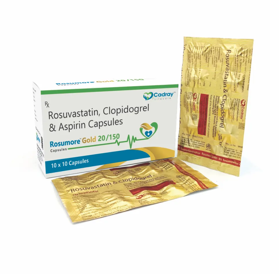 Rosumore Gold 20 - 150 capsules – Aspirin 75mg + Rosuvastatin 20mg + Clopidogrel 150mg