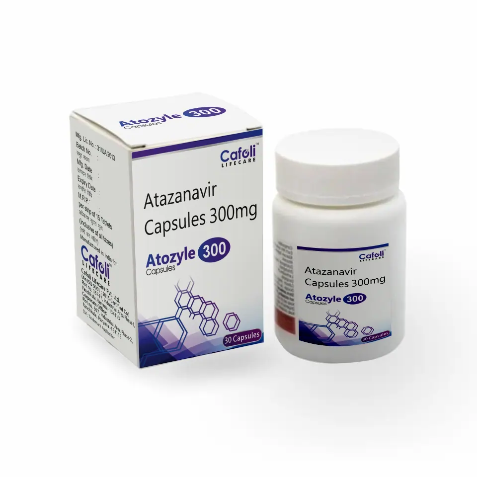 Atozyle 300 Capsule contains Atazanavir 300mg, a potent protease inhibitor widely used in the management of HIV-1 infection. It works by preventing the virus from multiplying inside the body, thereby reducing viral load and supporting immune recovery. This strength is commonly prescribed as part of combination therapy to achieve strong and sustained viral suppression.
