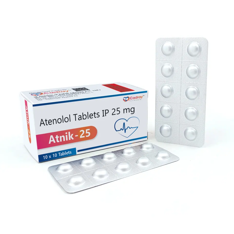 Atnik 25 Tablet contains Atenolol 25 mg, a selective beta-1 adrenergic blocker widely used to manage hypertension, angina pectoris, and cardiac arrhythmias. It reduces heart rate, myocardial contractility, and cardiac output, effectively controlling elevated blood pressure and improving cardiovascular stability.