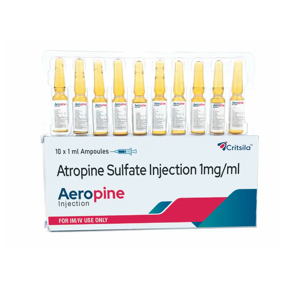 Aeropine Injection contains Atropine 1 mg, a muscarinic antagonist widely used in cardiology and pre-anesthetic applications. It is particularly effective in managing bradycardia, cardiac arrest emergencies, and for reducing secretions before anesthesia.