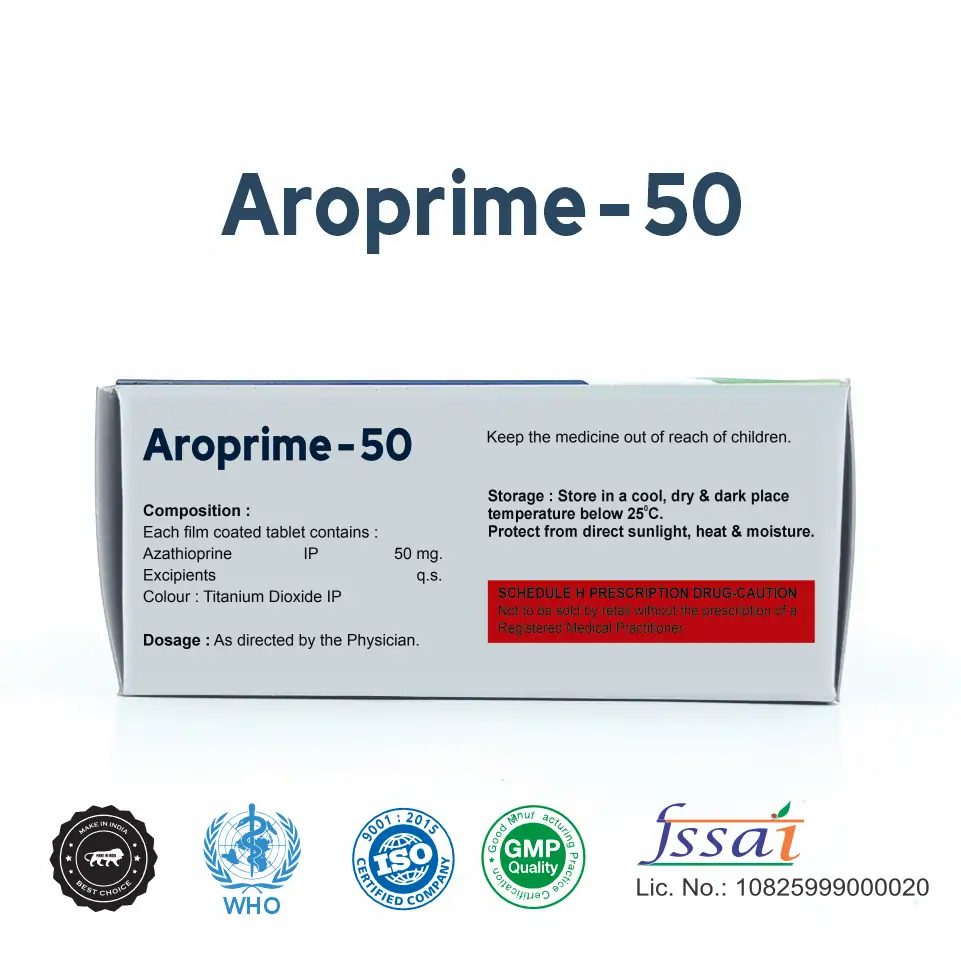 Aroprime Tablet contains Azathioprine (50mg), an immunosuppressant widely used in managing autoimmune diseases and organ transplant rejection. It helps reduce the activity of the immune system, preventing it from attacking healthy cells or transplanted organs. Azathioprine is commonly prescribed for rheumatoid arthritis, inflammatory bowel disease (Crohn’s disease, ulcerative colitis), lupus, and kidney transplants.