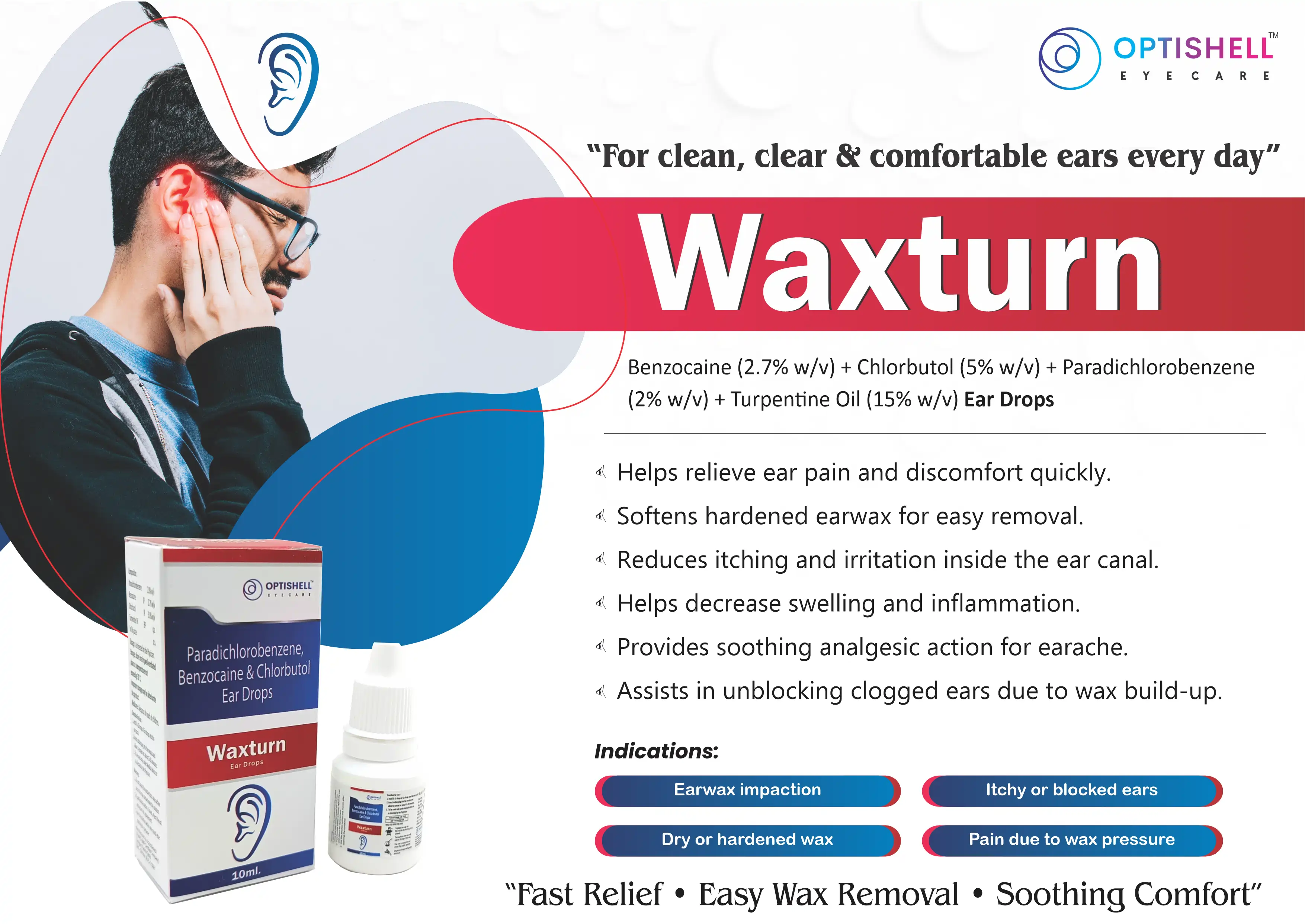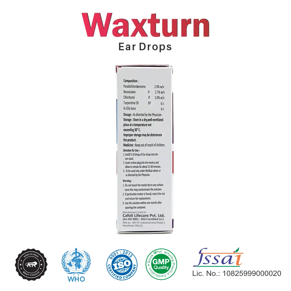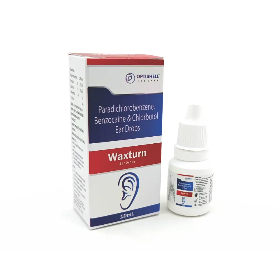Waxturn Ear Drops are formulated to provide effective relief from earwax buildup and associated discomfort. The active ingredients include benzocaine, chlorbutol, paradichlorobenzene, and turpentine oil, each playing a vital role in soothing irritation and promoting the softening and removal of earwax. Benzocaine serves as a local anesthetic, helping to alleviate pain, while chlorbutol acts as a mild antiseptic, preventing infections in the ear canal. Paradichlorobenzene is included for its properties in breaking down earwax, making it easier to clear out, and turpentine oil contributes additional antimicrobial effects, ensuring a clean and comfortable ear environment.