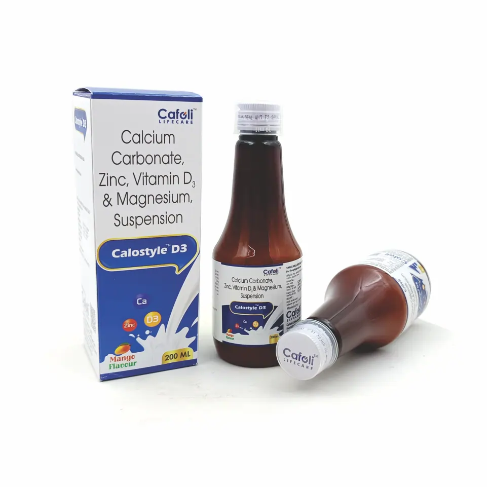 Calostyle D3 Syrup is a meticulously formulated dietary supplement designed to support bone health and enhance overall vitality. This syrup combines essential minerals and vitamins, specifically calcium carbonate (625 mg), magnesium hydroxide (180 mg), zinc sulfate monohydrate (14 mg), and vitamin D3 (200 IU), to provide a synergistic effect that promotes optimal physiological function.