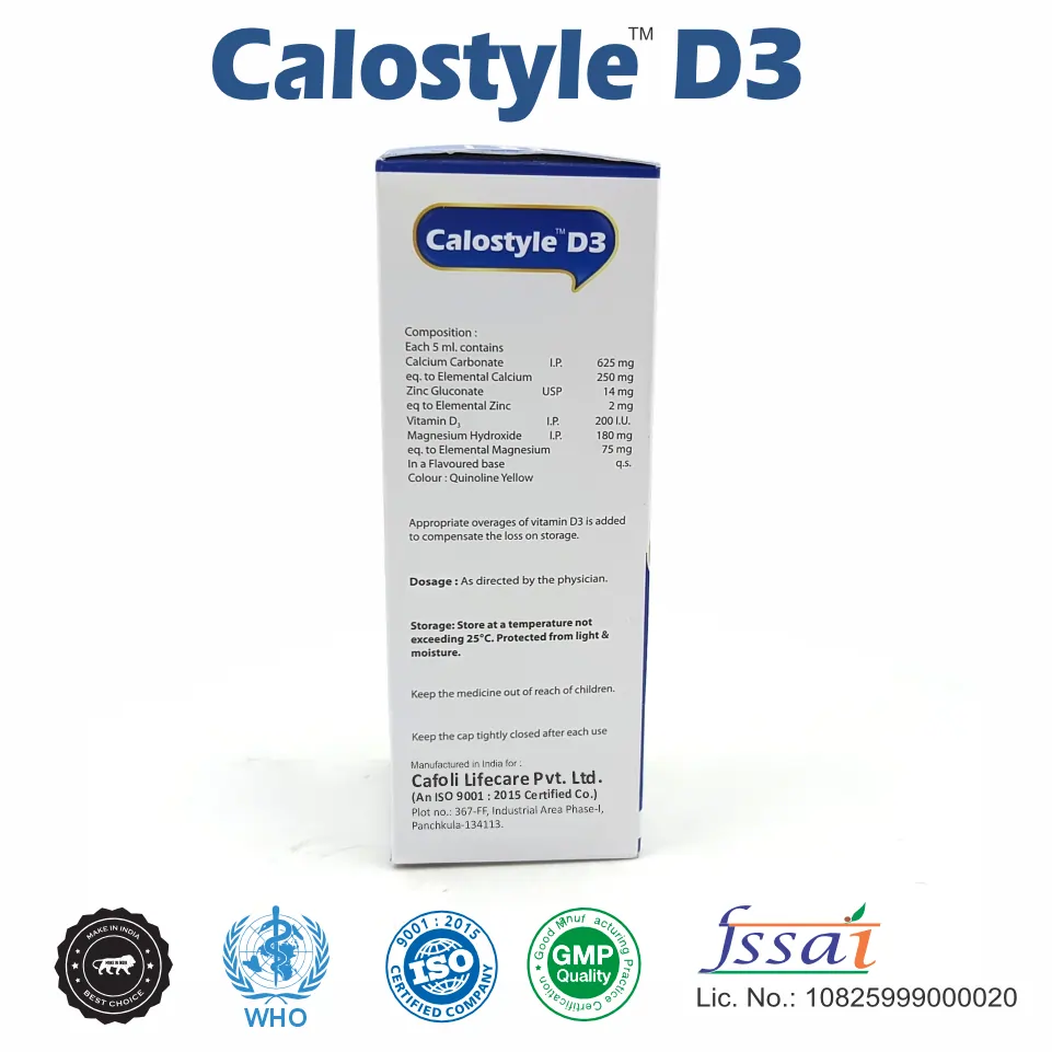 Calostyle D3 Syrup is indicated for the prevention and treatment of calcium and vitamin D3 deficiencies, supporting bone mineralization and overall skeletal health. It may also be beneficial for individuals at risk of osteoporosis, those with limited sun exposure, and those with dietary restrictions.