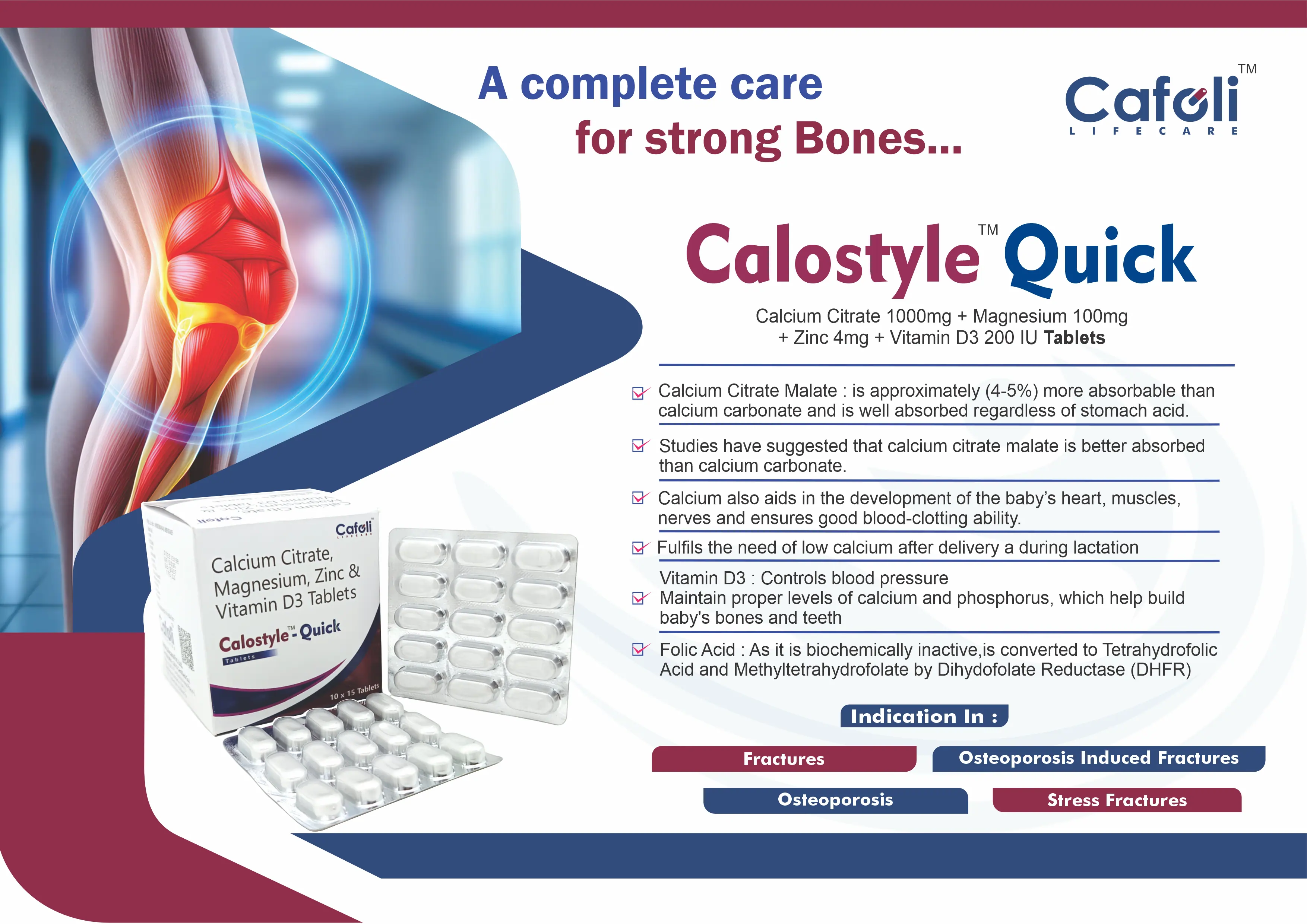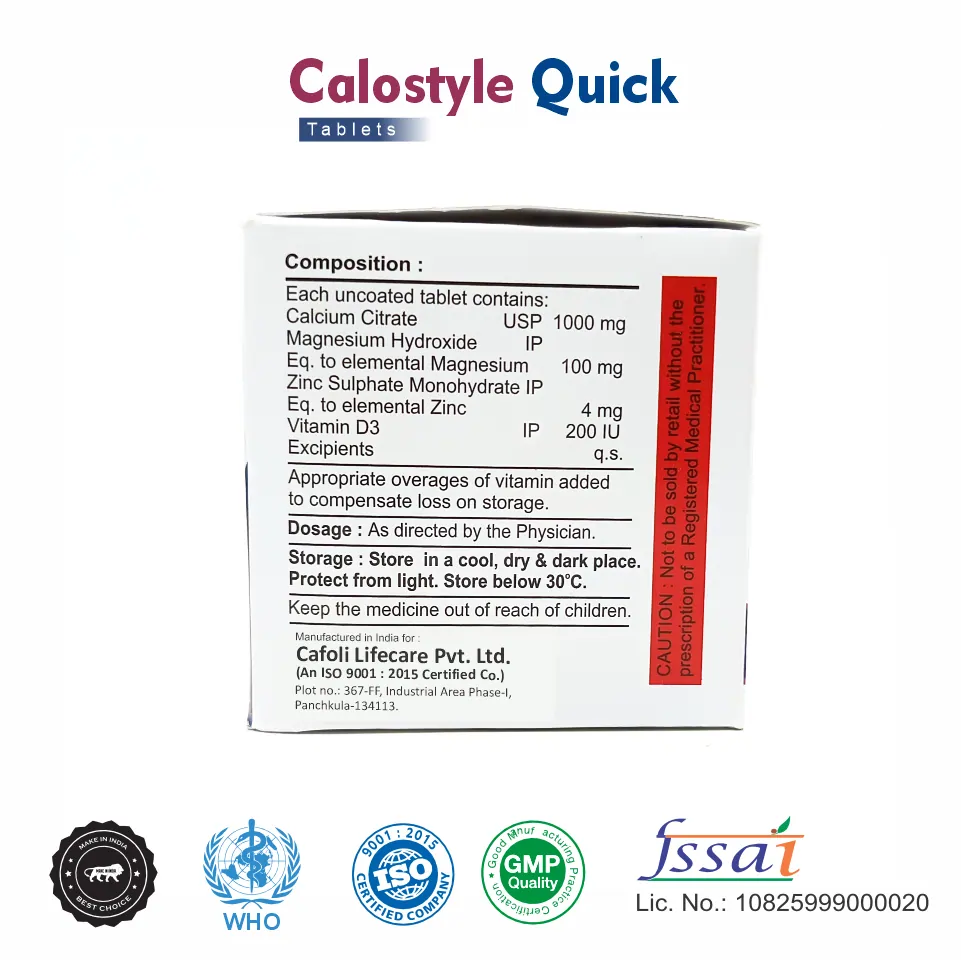 Calostyle Quick Tablet is a nutraceutical formulation designed to promote optimal bone health and support overall well-being. The high bioavailability of Calcium Citrate ensures better absorption, aiding in the prevention and management of calcium deficiency, osteoporosis, and other bone-related conditions. Vitamin D3 facilitates calcium absorption and enhances bone density, while Zinc Sulfate supports immune function and cellular repair. Magnesium Sulphate contributes to bone mineralization and helps maintain muscular and nervous system balance. Calostyle Quick Tablet is an excellent choice for individuals requiring additional calcium supplementation due to aging, pregnancy, lactation, or certain medical conditions.