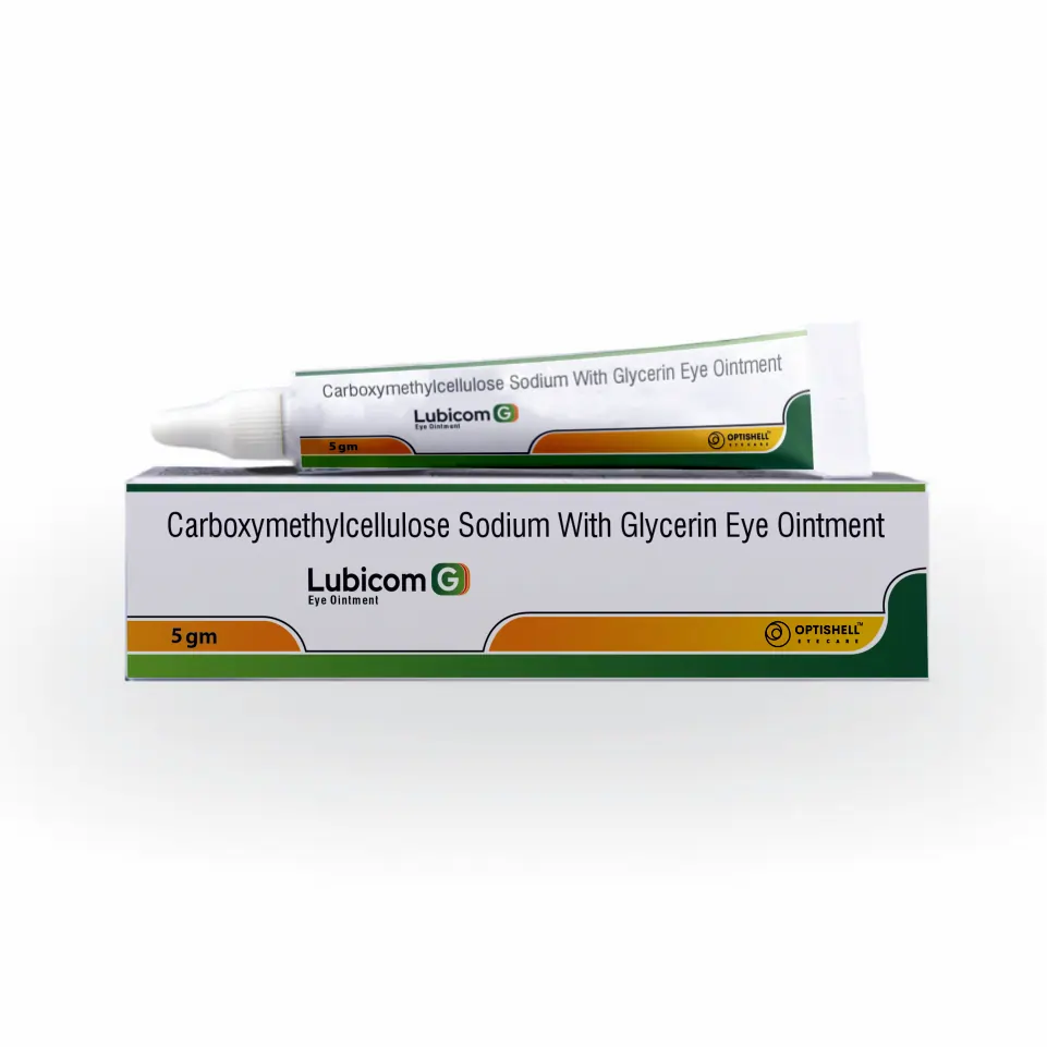 Lubicom G Eye Ointment contains Carboxymethylcellulose 0.3% w/w + Glycerin 1% w/w, a lubricating ophthalmic ointment used for dry eye syndrome, eye irritation, and ocular surface protection.