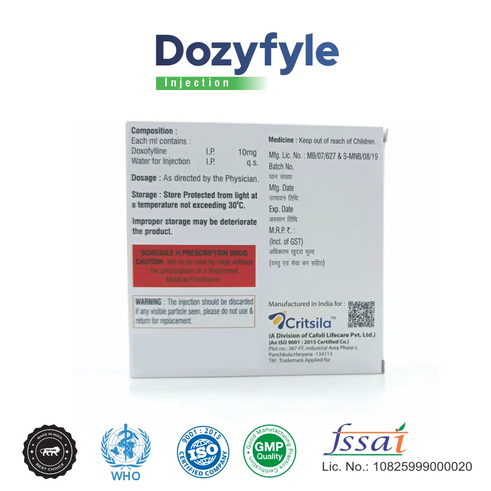 Dozyfyle Injection contains Doxofylline (100mg), a bronchodilator that helps relax and open the airways in the lungs. Doxofylline works by inhibiting phosphodiesterase enzymes, leading to smooth muscle relaxation in the bronchial passages, which eases breathing in patients with obstructive airway conditions.