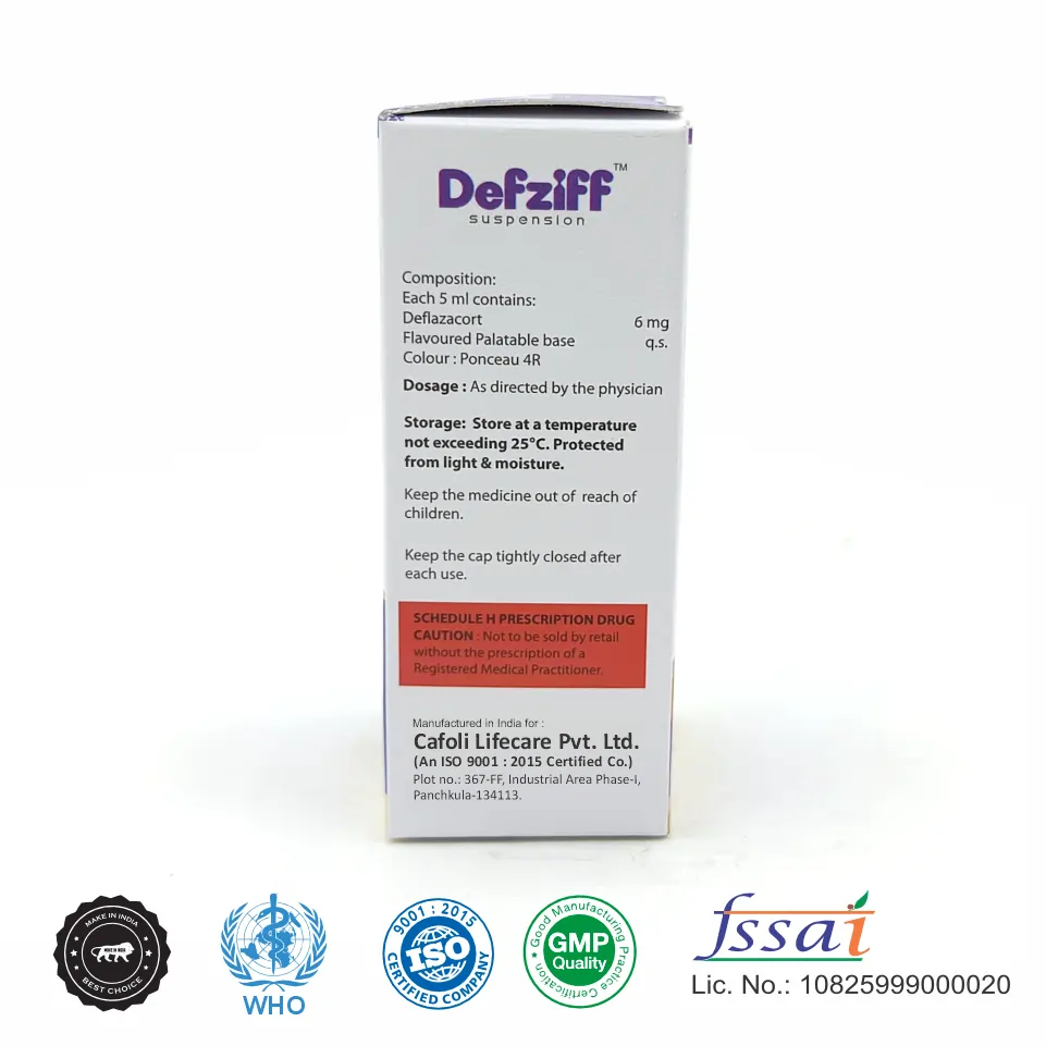 Consult your healthcare provider before use, especially if you have underlying health conditions or are taking other medications. In summary, Defziff Oral Suspension provides a vital treatment option for managing a variety of inflammatory and autoimmune conditions. Its convenient liquid form facilitates easier administration, particularly for younger patients or those with swallowing difficulties. Always follow the guidance of a healthcare professional when using this medication to ensure safe and effective treatment.