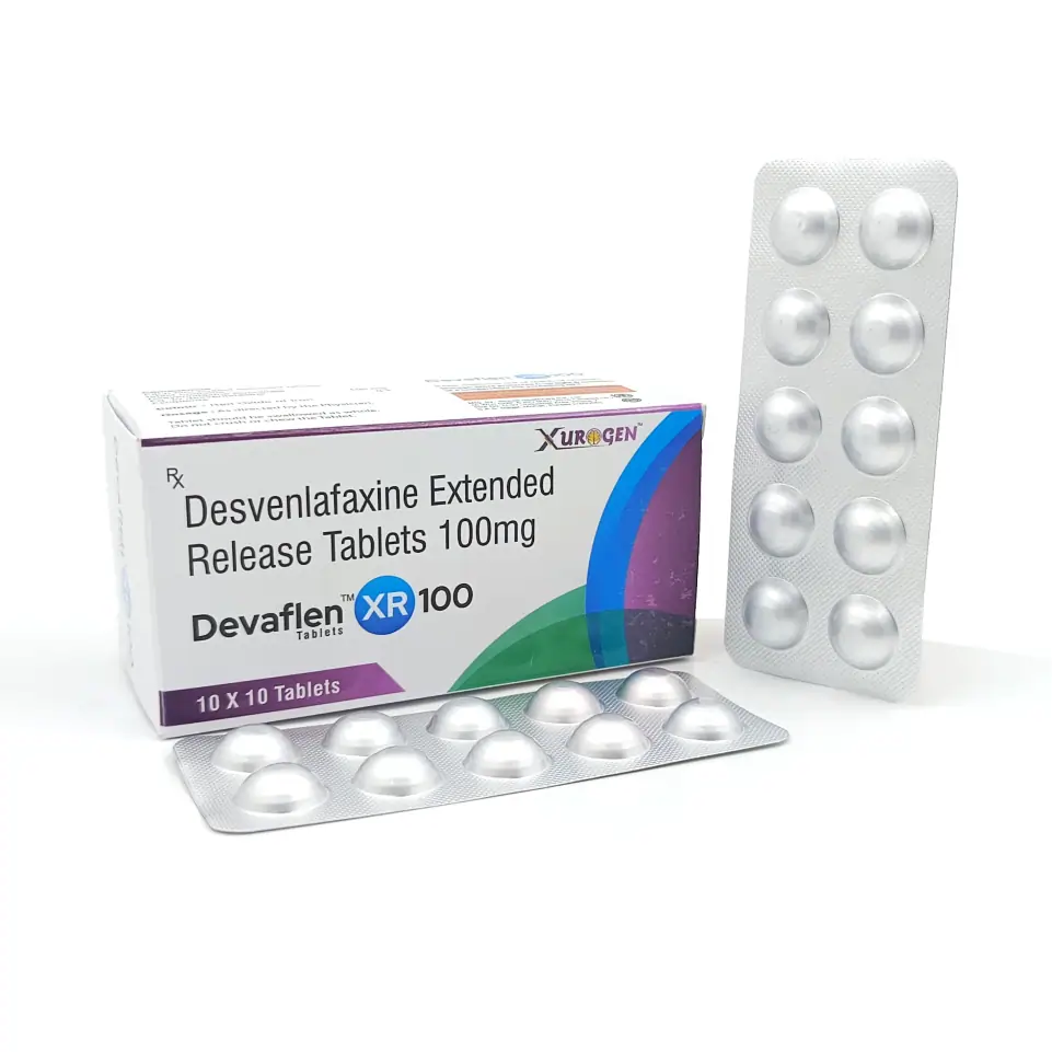 Devaflen XR 100 Tablet contains Desvenlafaxine 100mg, an extended-release formulation belonging to the SNRI (Serotonin-Norepinephrine Reuptake Inhibitor) class. It is commonly prescribed for managing major depressive disorder (MDD), anxiety symptoms, mood instability, and emotional stress-related imbalances.