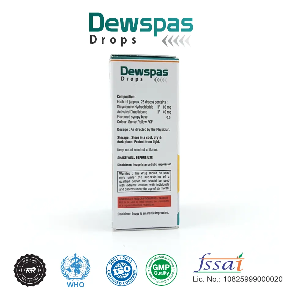 Dewspas Drop contains Dicyclomine 10mg + Dimethicone 40mg, a combination used for relieving abdominal cramps, spasms, and gas-related discomfort. It helps restore digestive comfort and reduce bloating, making it ideal for patients with functional gastrointestinal disorders.