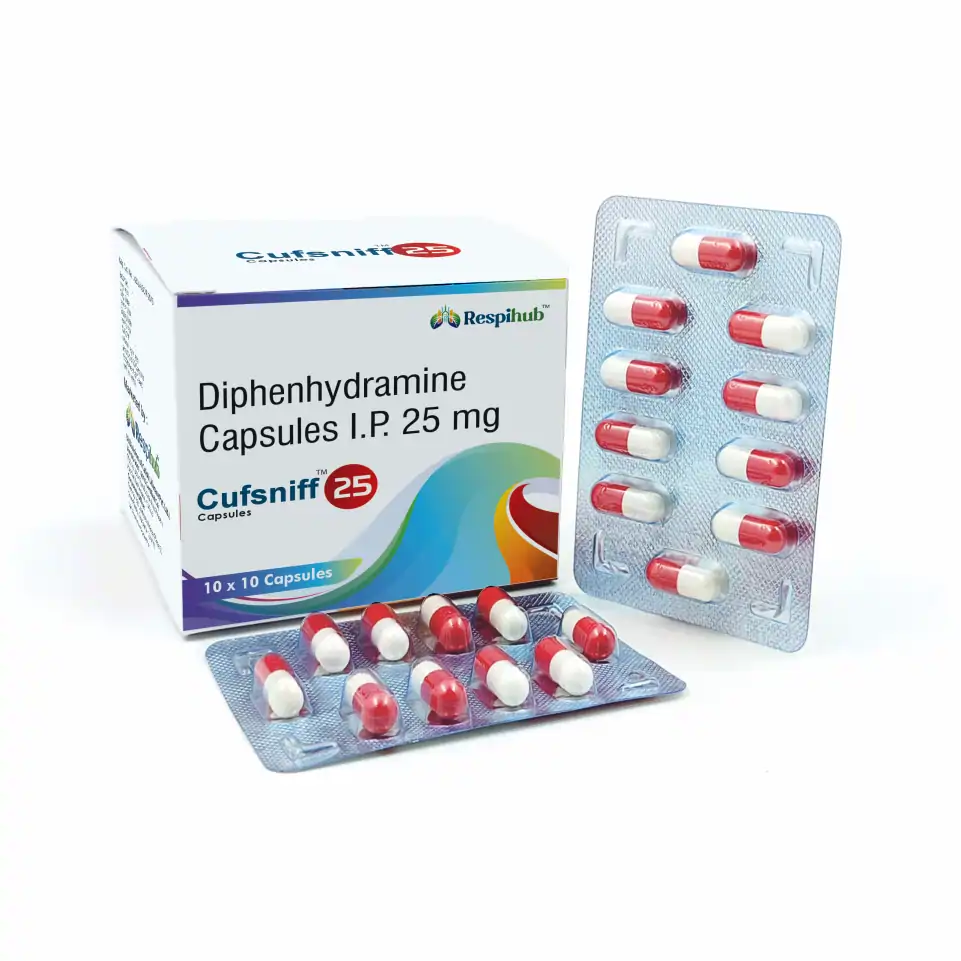 Cufsniff 25 Capsule contains Diphenhydramine 25mg, an effective antihistamine for managing allergy symptoms, cold, and cough. It works by blocking histamine receptors, reducing sneezing, itching, and other allergic reactions.