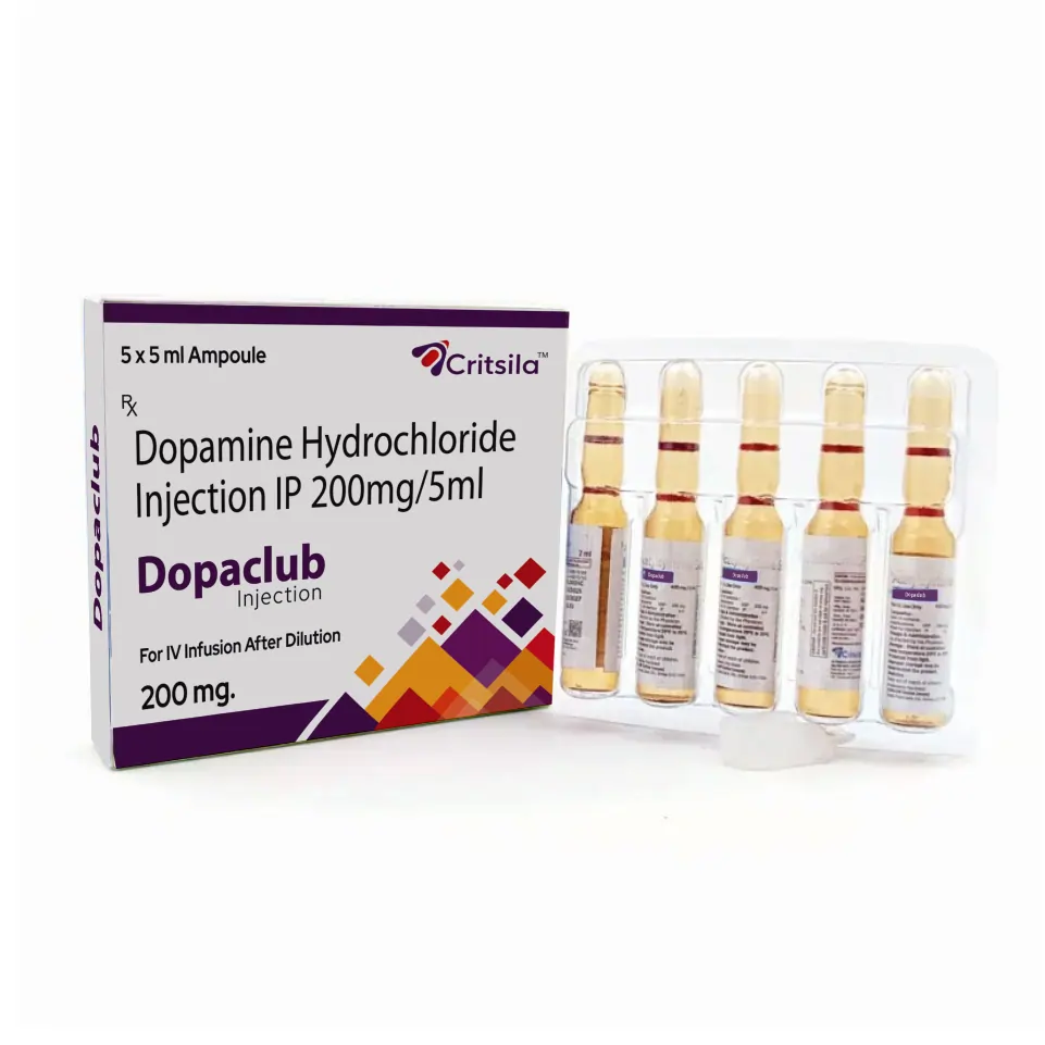 Dopaclub Injection contains Dopamine (200mg), a sympathomimetic agent that acts on the heart and blood vessels to improve blood flow and blood pressure. Dopamine works by stimulating specific receptors in the heart and kidneys, helping to increase cardiac output, improve circulation, and support kidney function in cases of low blood pressure or shock.
