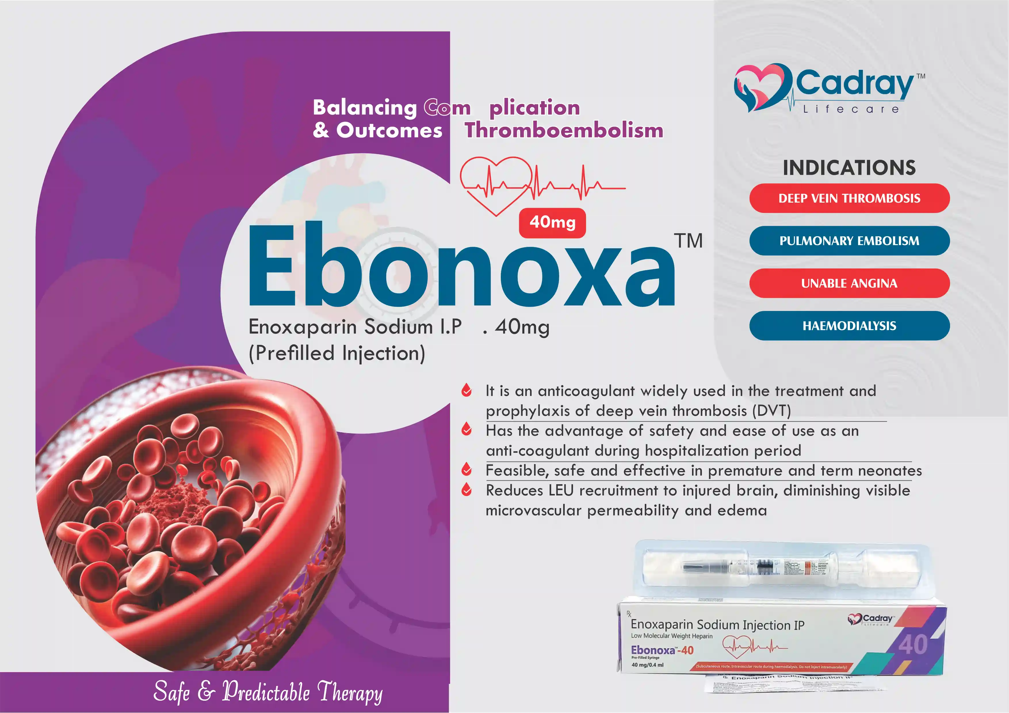 Ebonoxa 40 Injection contains Enoxaparin (40mg), a low-molecular-weight heparin (LMWH) used primarily as an anticoagulant to prevent and treat thromboembolic disorders. It works by inhibiting specific clotting factors in the blood, thereby reducing the risk of harmful blood clots. Ebonoxa is commonly prescribed to prevent deep vein thrombosis (DVT), pulmonary embolism (PE), or to manage conditions such as unstable angina and non-ST elevation myocardial infarction (NSTEMI). It may also be used for patients undergoing surgery, particularly orthopedic or abdominal surgery, to prevent clot formation during recovery.