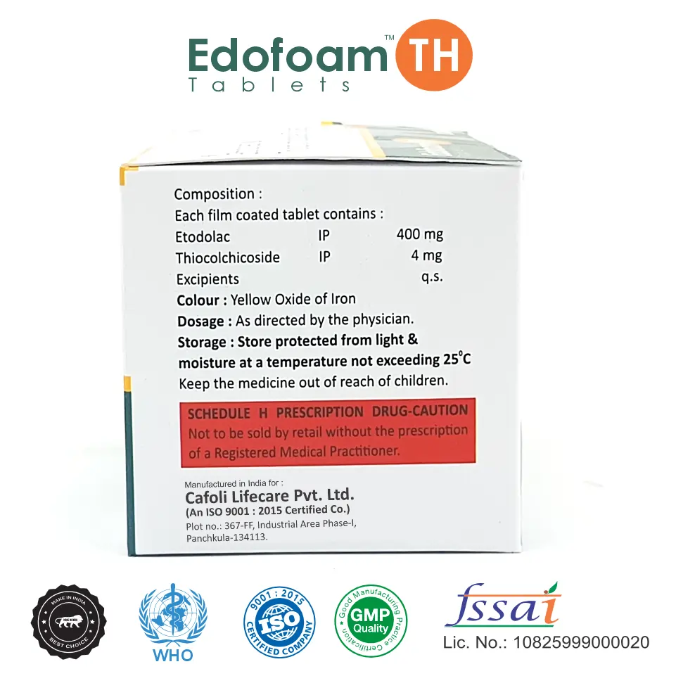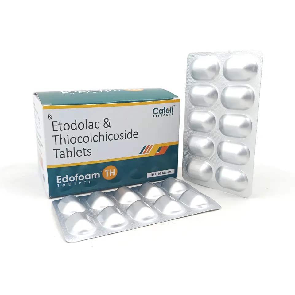 Edofoam TH Tablet is a combination medication designed to provide effective relief from pain and muscle spasms associated with musculoskeletal conditions. It contains Etodolac, a non-steroidal anti-inflammatory drug (NSAID), and Thiocolchicoside, a muscle relaxant with anti-inflammatory properties.
