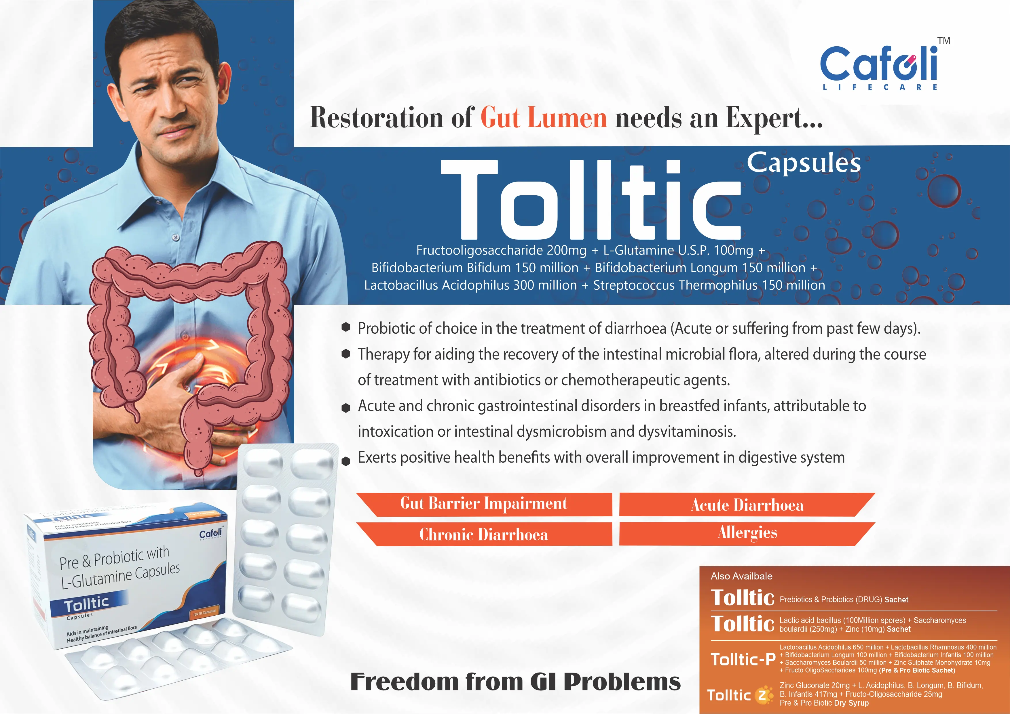 Fructooligosaccharide (FOS), a prebiotic, acts as a food source for beneficial bacteria, aiding in their growth and activity. L-Glutamine is an amino acid that helps maintain the health of the intestinal lining, playing a crucial role in gut integrity and supporting overall digestive function. The probiotics present in Tolltic, including Bifidobacterium Bifidum, Bifidobacterium Longum, Lactobacillus Acidophilus, and Streptococcus Thermophilus, are well-known for their ability to support the microbiome, improve digestive health, and boost immunity.