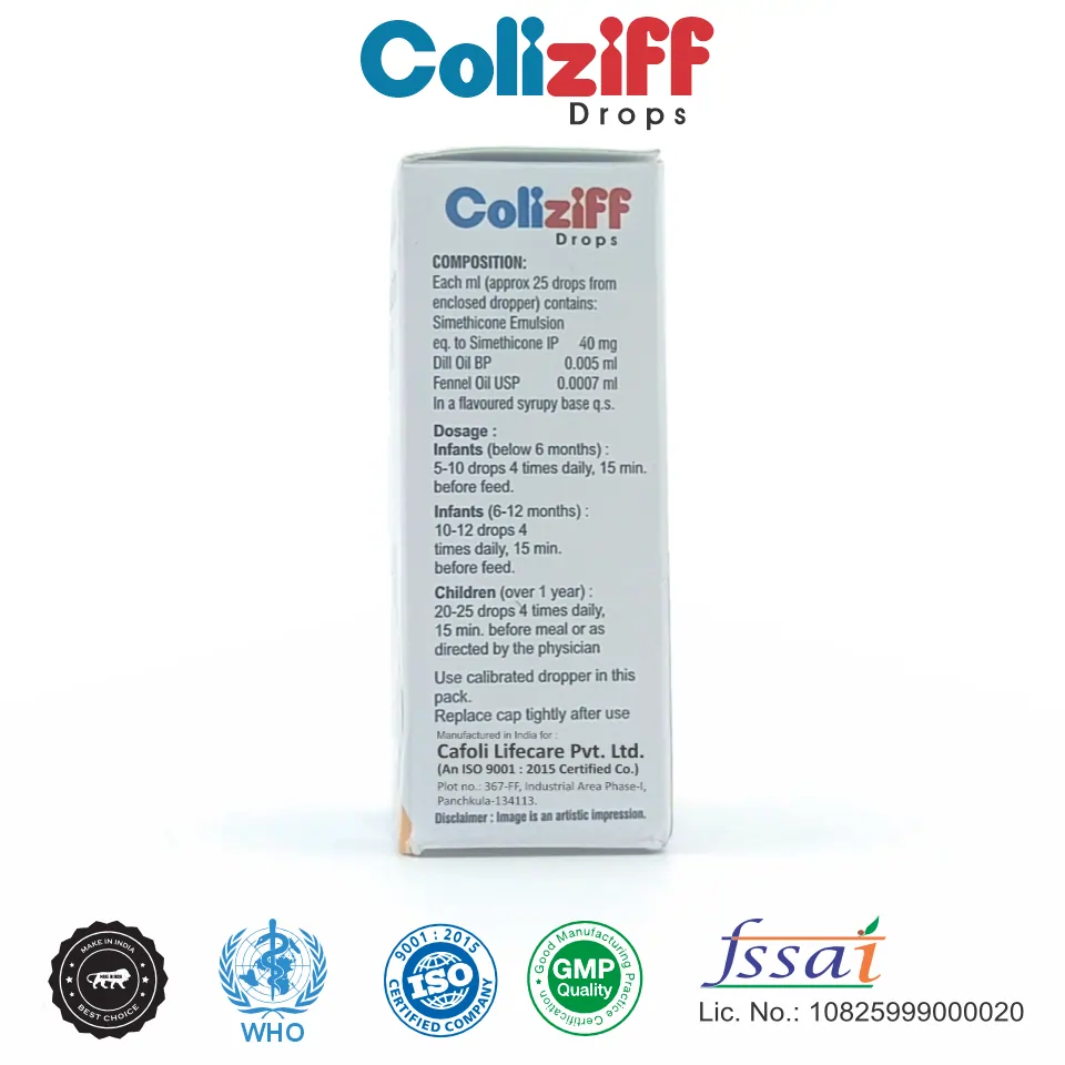 Coliziff Drop contains Dill Oil 0.005ml + Fennel Oil 0.0007ml + Simethicone 40mg, a pediatric formulation designed to relieve gas, colic, bloating, and digestive discomfort in infants and children. It helps improve digestion and eases abdominal discomfort naturally.