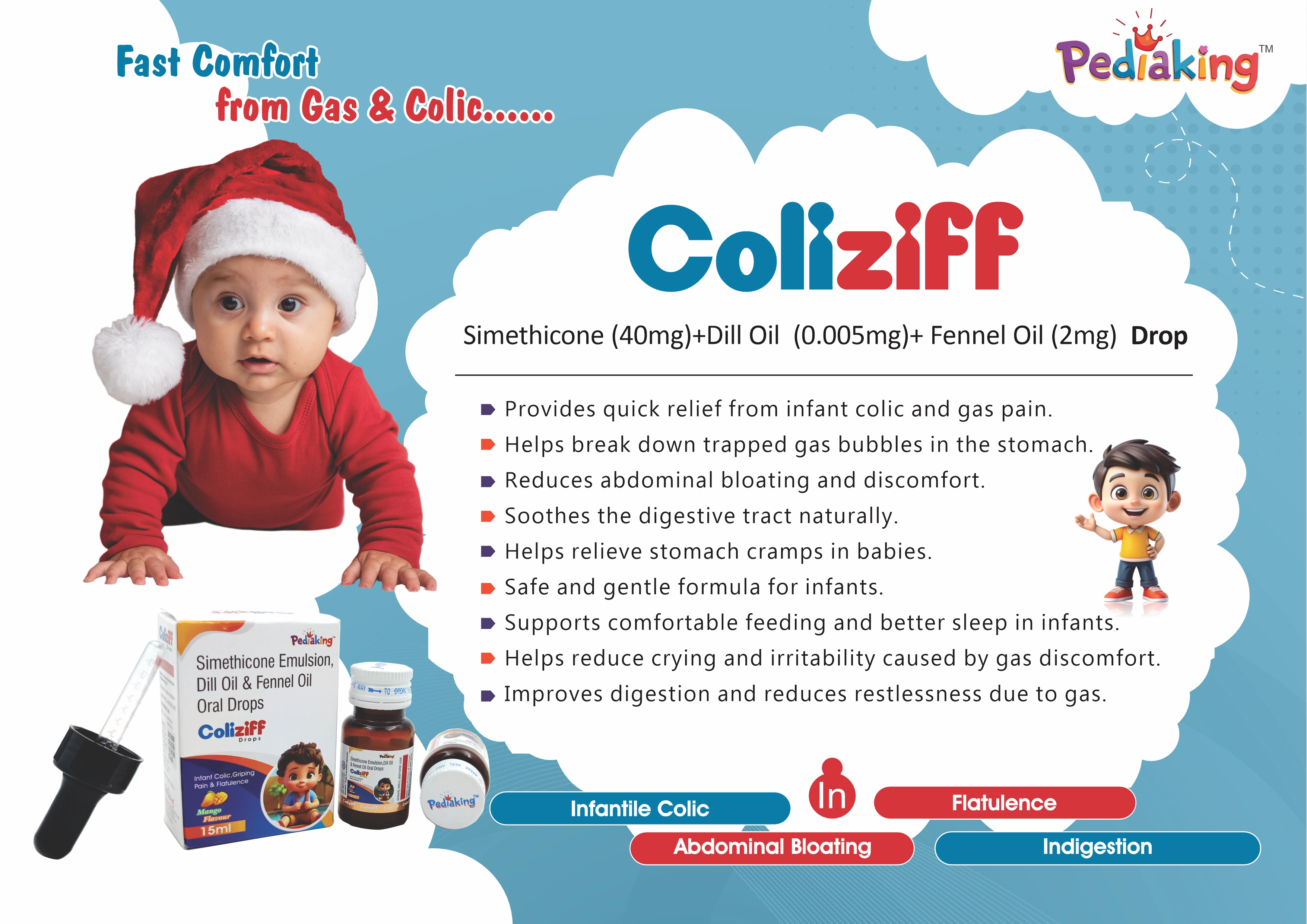 Dill Oil and Fennel Oil provide gentle digestive soothing and carminative effects, while Simethicone works as an anti-foaming agent to reduce gas bubbles and bloating. This combination ensures fast relief from digestive issues.