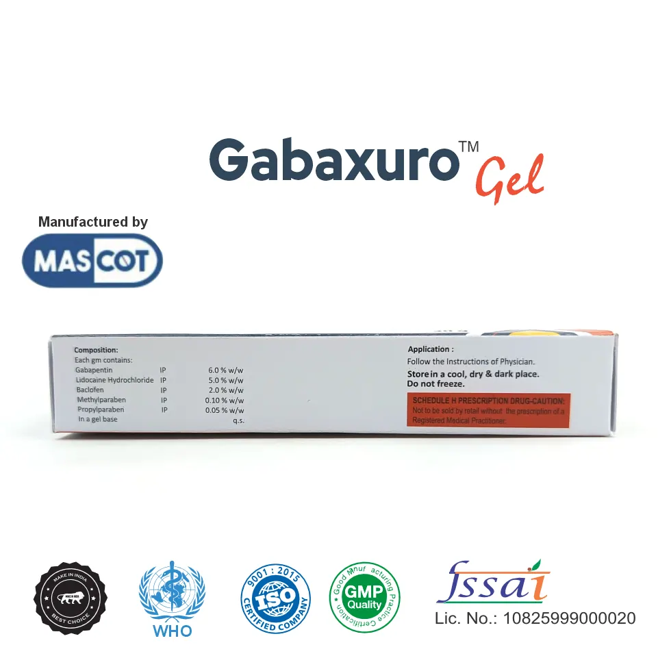 Gabaxuro L Gel combines Gabapentin (6% w/w) and Lidocaine (5% w/w) in a topical formulation designed for effective management of localized neuropathic pain. Gabapentin, a gamma-aminobutyric acid (GABA) analog, reduces nerve-related pain by modulating calcium channels in nerve cells, thereby decreasing abnormal nerve signaling. Lidocaine, a well-known local anesthetic, blocks pain signals at the site of application by inhibiting sodium channels in the nerve endings, providing quick and targeted relief.