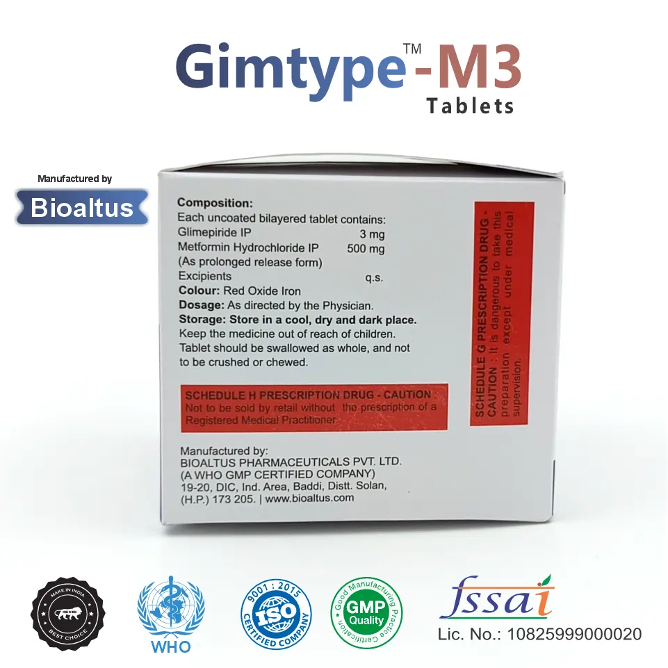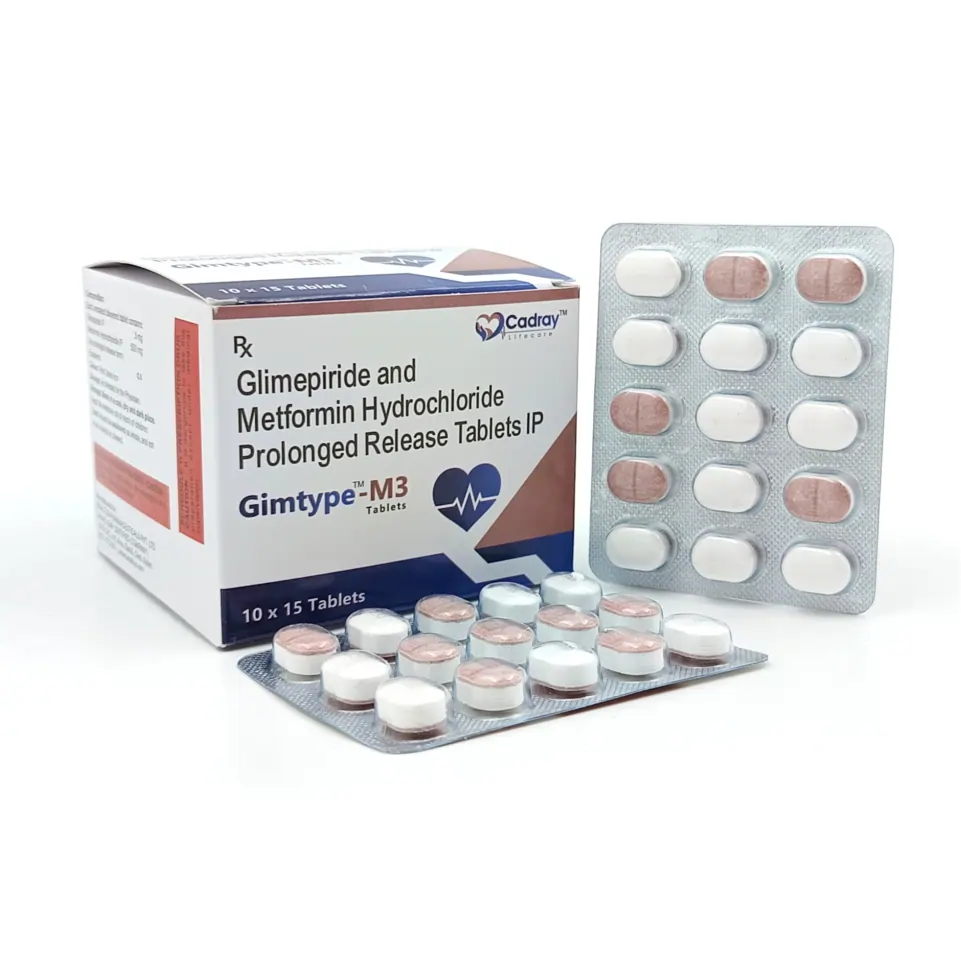 Gimtype M3 Tablet is a combination of Glimepiride 3mg and Metformin Hydrochloride 500mg in a sustained-release bi-layered formulation. It is designed to offer dual benefits in the management of type 2 diabetes mellitus by improving glycemic control. Glimepiride, a sulfonylurea, stimulates insulin secretion from the pancreas, while Metformin enhances insulin sensitivity and reduces hepatic glucose production. The bi-layered design ensures optimal release for prolonged efficacy.