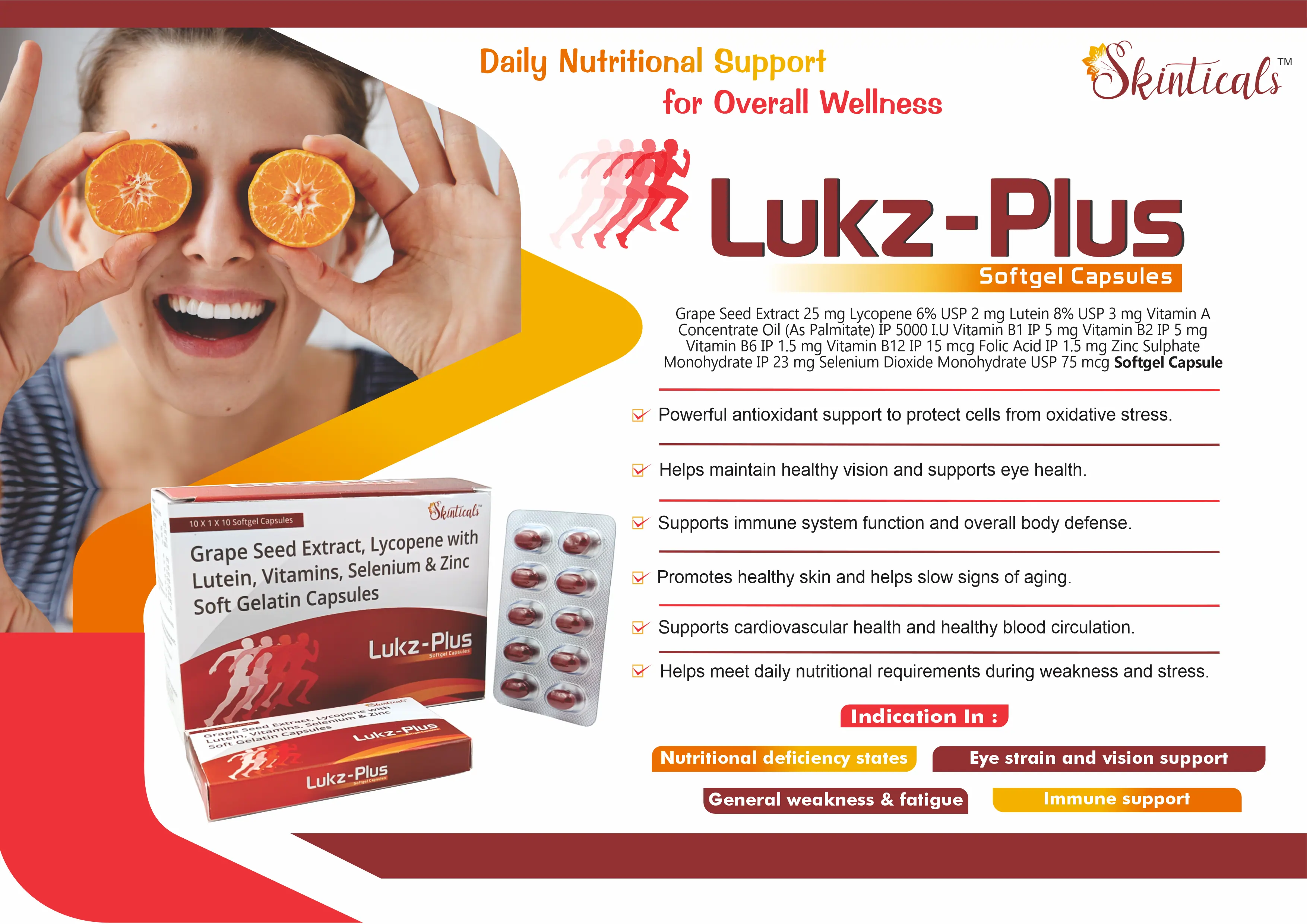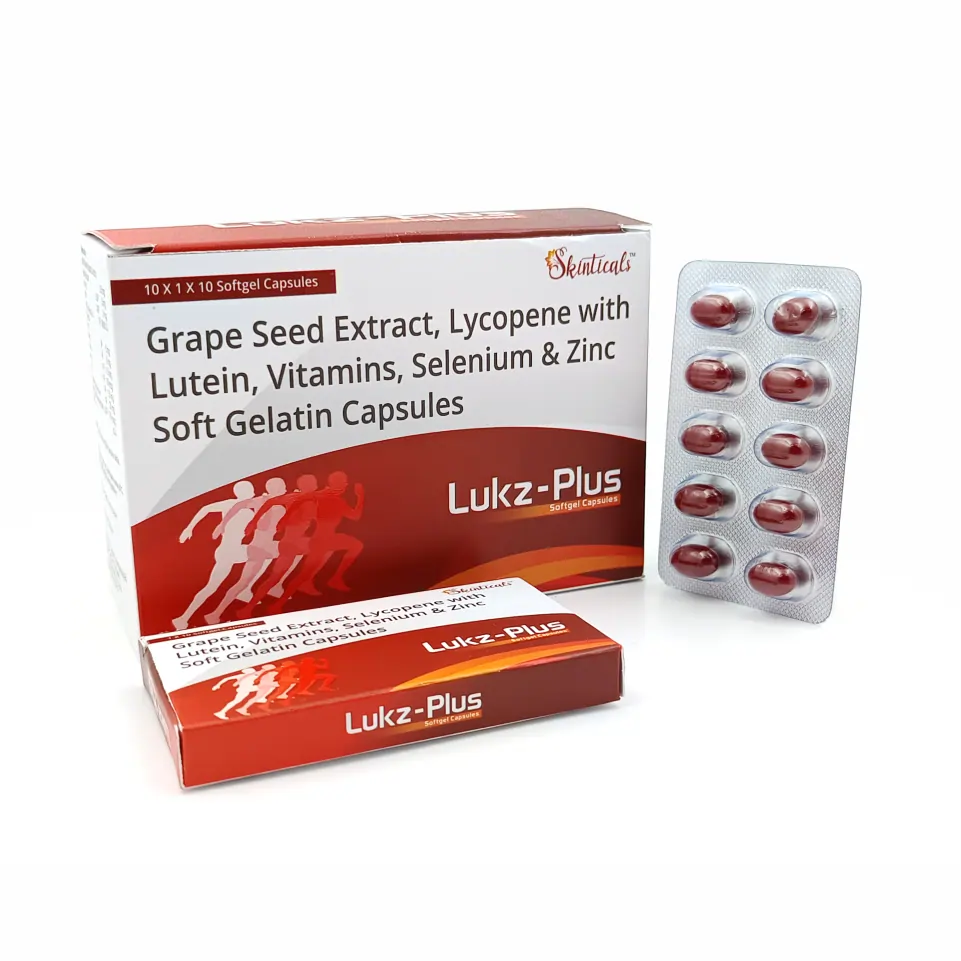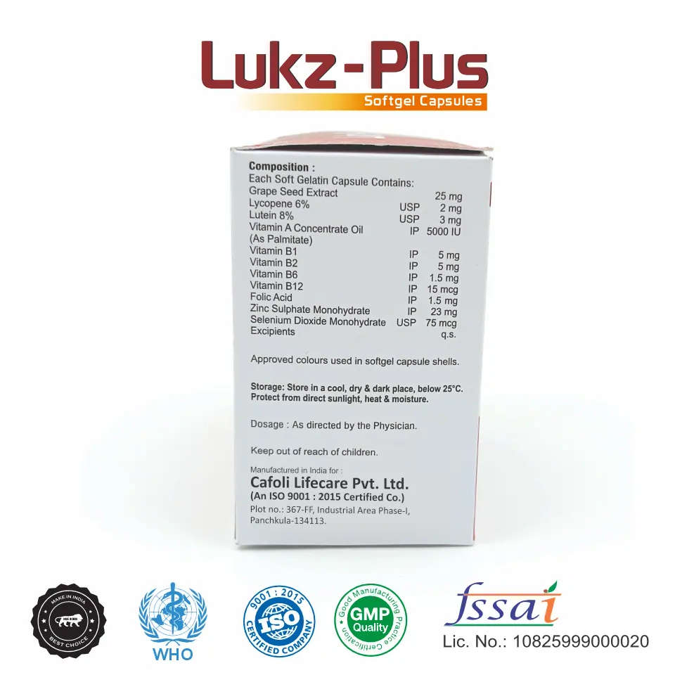 Lukz Plus Softgel is a premium multivitamin antioxidant formulation containing Grape Seed Extract 25 mg, Lycopene 6% USP 2 mg, Lutein 8% USP 3 mg, along with Vitamin A, B-Complex vitamins, Zinc, and Selenium, designed to provide comprehensive nutritional and antioxidant support.