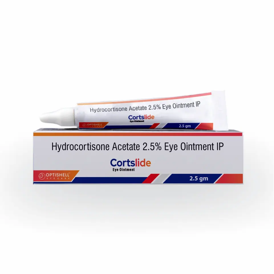 Cortslide Eye Ointment contains Hydrocortisone 2.5 mg, a mild corticosteroid ophthalmic ointment used for the treatment of eye inflammation, redness, irritation, and allergic eye conditions.