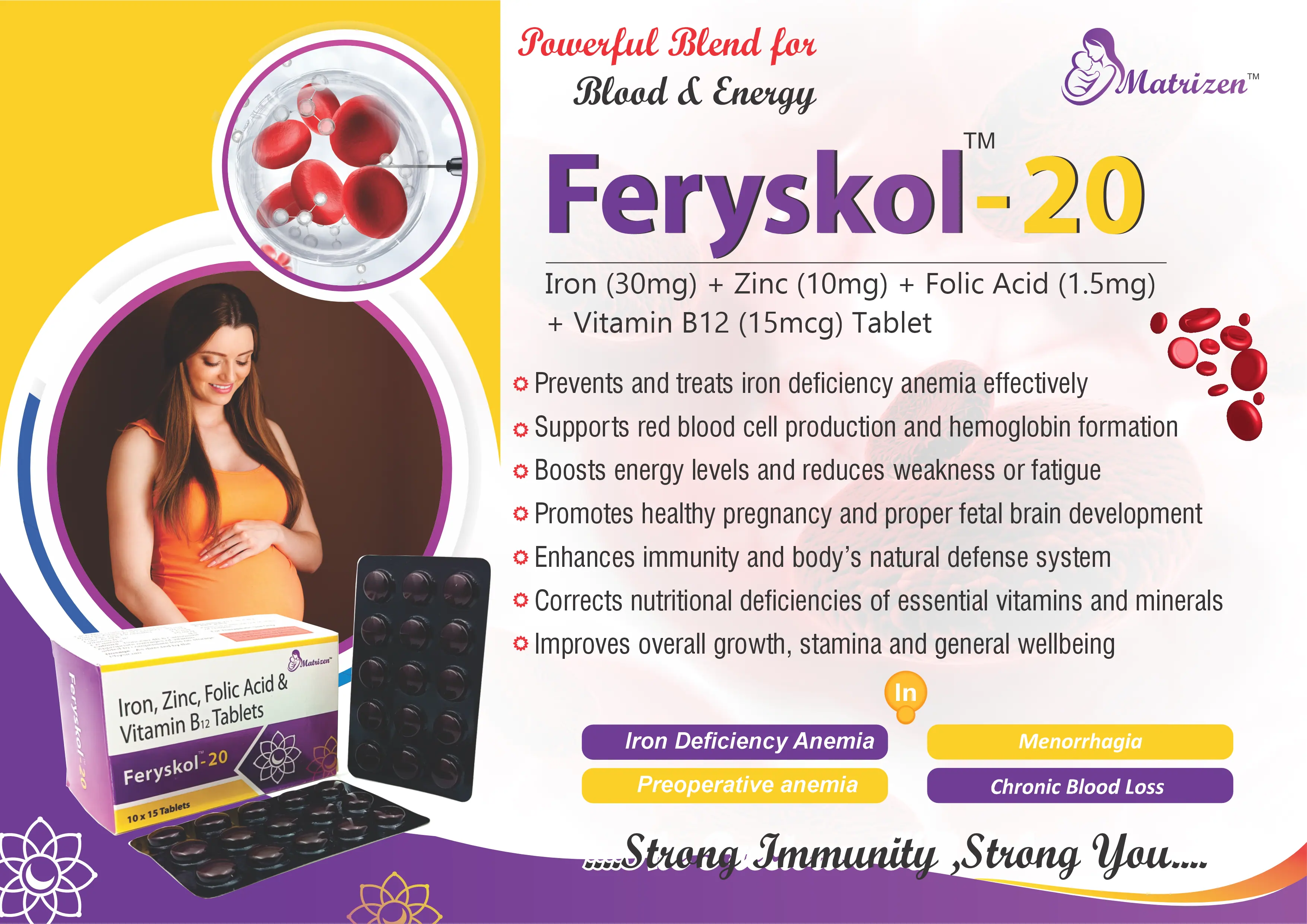 It helps in the prevention and treatment of iron deficiency anemia, nutritional deficiencies during pregnancy, general fatigue, weakness, and low immunity levels. This supplement is especially beneficial for women of reproductive age, pregnant and lactating women, growing adolescents, and individuals recovering from illness or surgery.