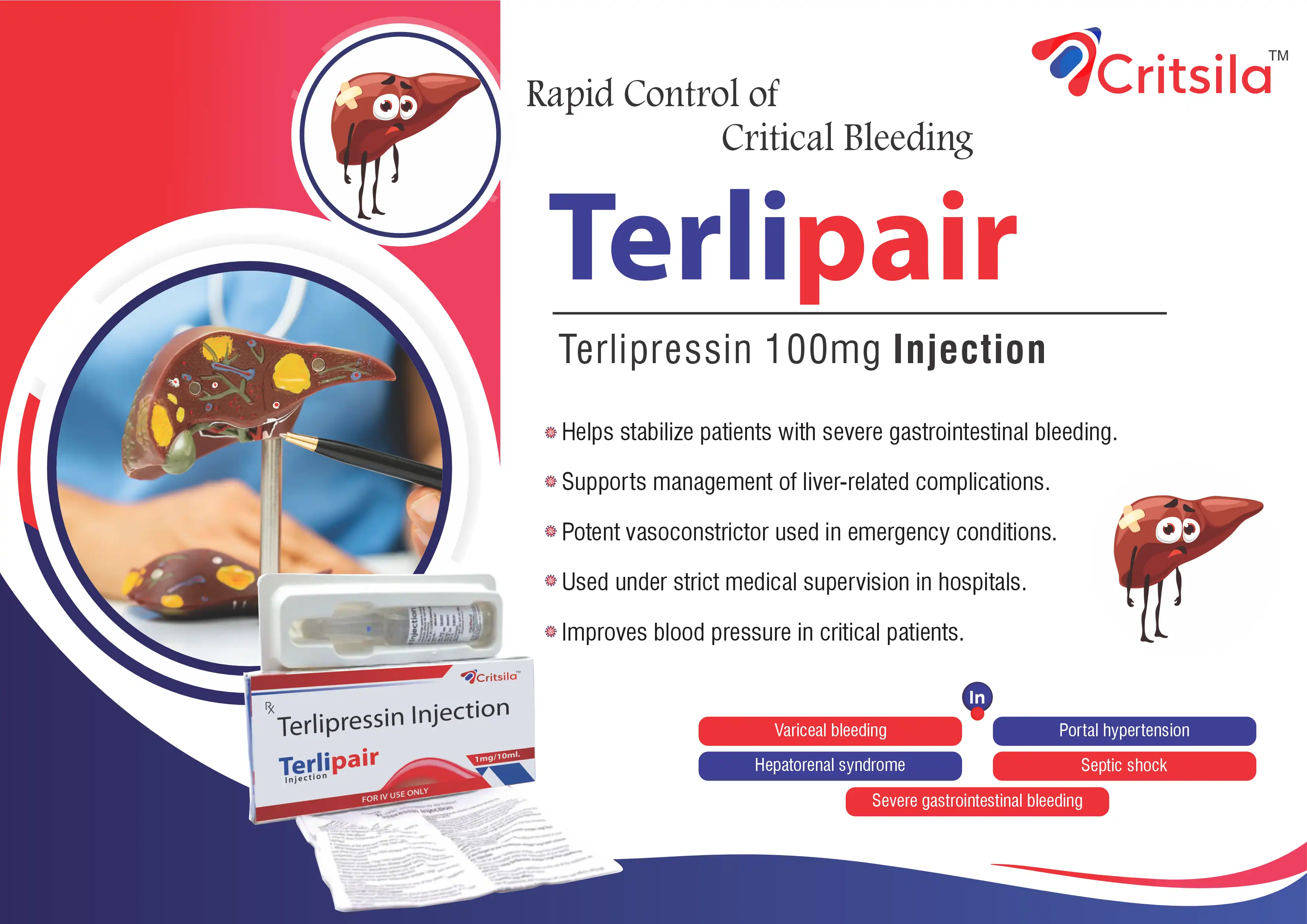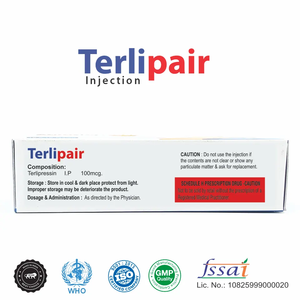 Terlipair Injection is a medication containing Terlipressin, a synthetic vasopressin analogue. It is used primarily for the management of certain cardiovascular conditions and is known for its ability to improve circulation and support the function of blood vessels. By constricting blood vessels, Terlipressin effectively raises blood pressure in cases of hypotension (low blood pressure) caused by conditions such as septic shock, or to manage variceal bleeding in patients with cirrhosis of the liver.