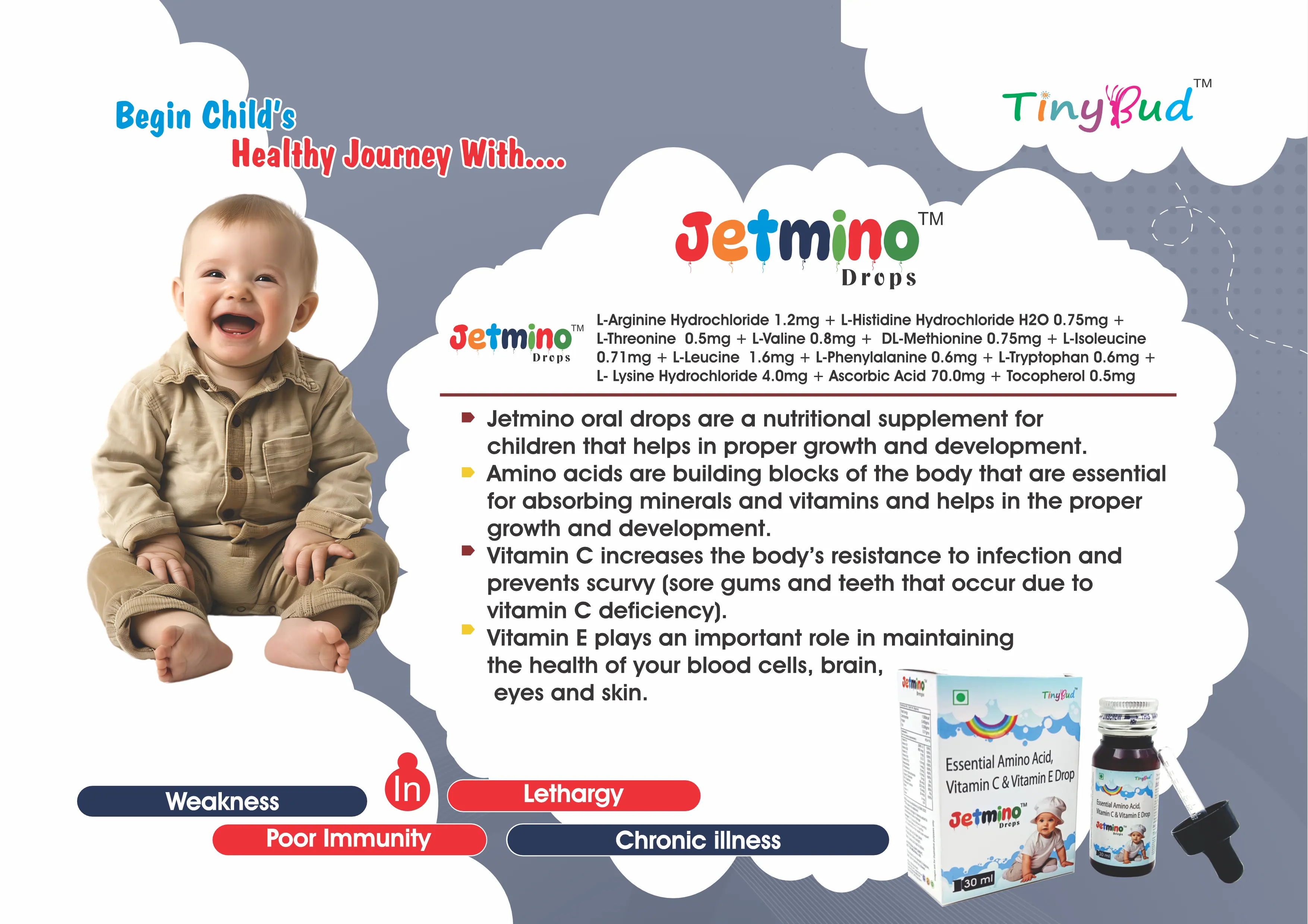 Jetmino Drop is a specialized formulation designed to provide essential amino acids and vitamins that support overall health and wellness. Combining a potent blend of amino acids and vital nutrients such as L-Arginine, L-Histidine, L-Threonine, and L-Valine, Jetmino Drop helps maintain the balance of proteins in the body and supports muscle growth, repair, and overall metabolic health.