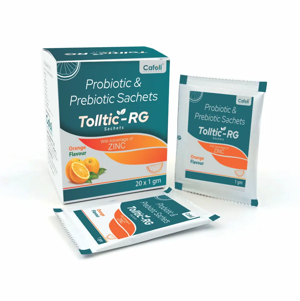 Tolltic RG Sachet is a comprehensive probiotic formulation combining Lactobacillus acidophilus (650 million CFU), Lactobacillus rhamnosus (400 million CFU), Bifidobacterium longum (100 million CFU), Bifidobacterium infantis (100 million CFU), Saccharomyces boulardii (50 million CFU), Zinc Sulphate Monohydrate equivalent to elemental Zinc (10 mg), and Fructo Oligosaccharides (100 mg). This advanced blend supports gut health, boosts immunity, and prevents gastrointestinal disturbances.