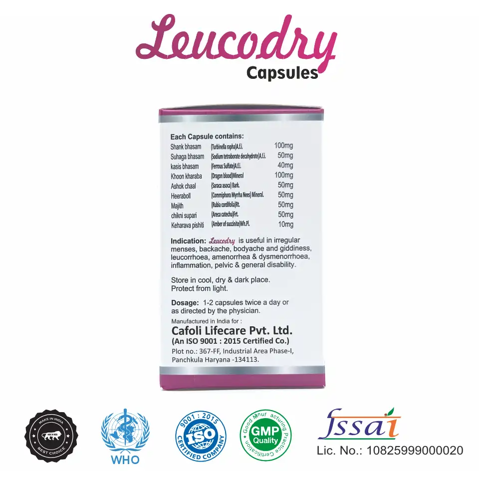 Leucodry Capsules are an Ayurvedic formulation specifically designed to help manage leucorrhoea (white vaginal discharge), a common concern among women, often accompanied by weakness, itching, backache, and discomfort. Rooted in the principles of Ayurveda, this herbal remedy targets the root causes of excessive or abnormal vaginal discharge by balancing bodily energies (doshas), strengthening the reproductive system, and enhancing overall feminine wellness.