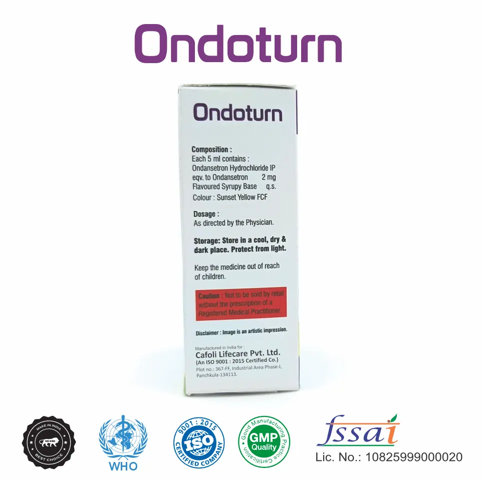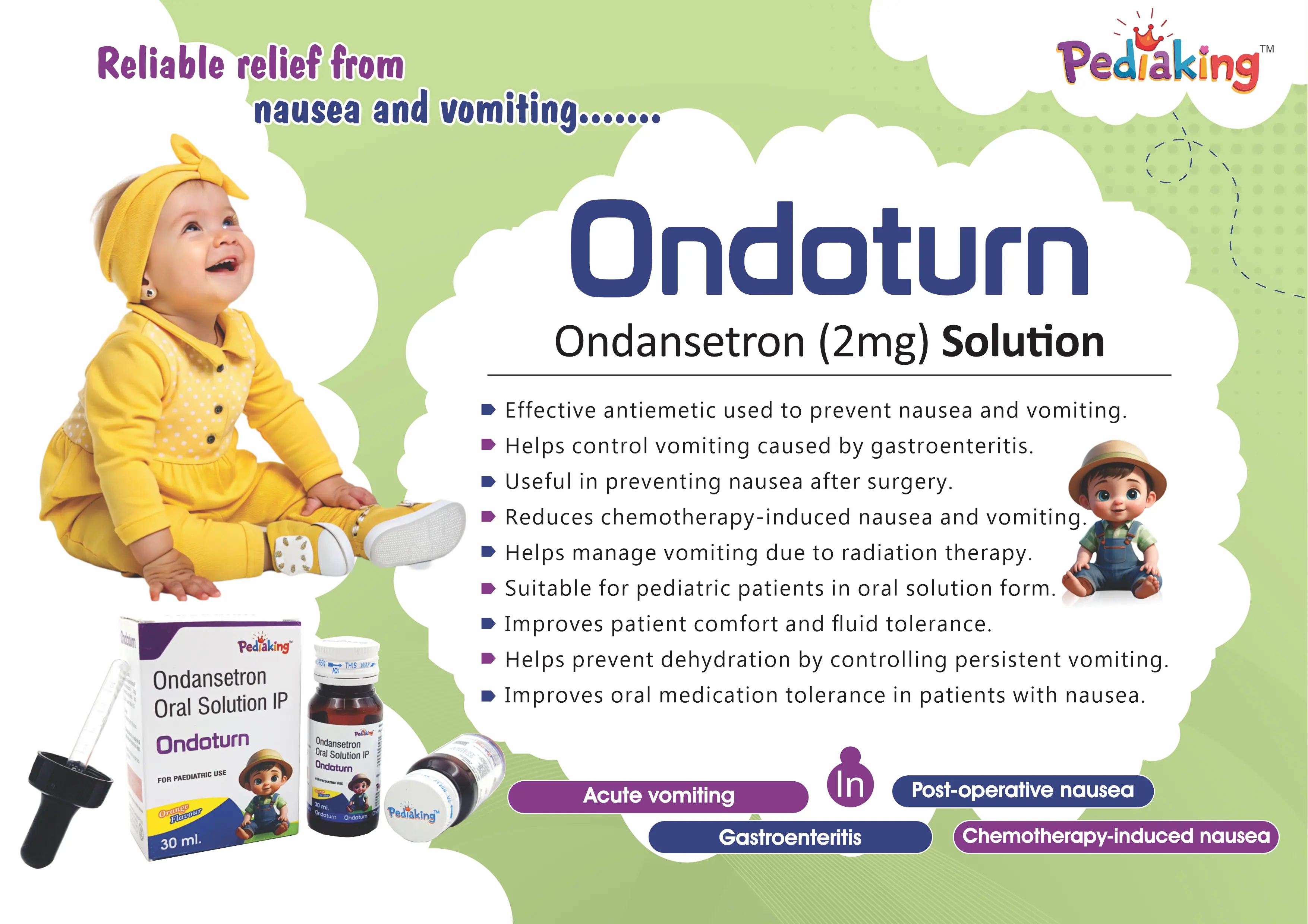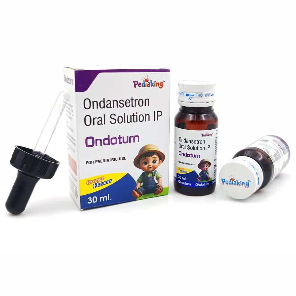 Ondoturn Drops contains Ondansetron 2mg, a pediatric antiemetic indicated for relief from nausea and vomiting caused by infections, chemotherapy, or other conditions. It helps children maintain hydration and comfort during episodes of vomiting.
