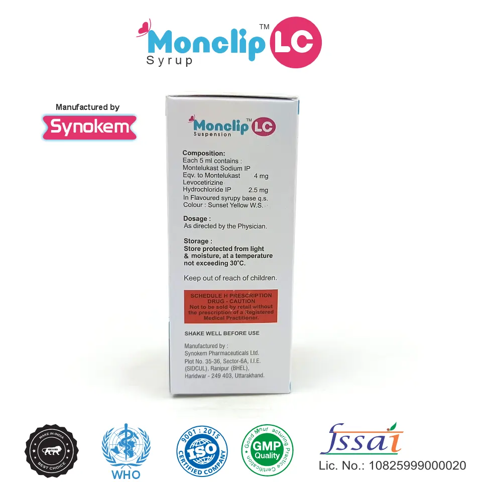 Monclip LC Suspension is intended for pediatric use and should be administered under the supervision of a healthcare provider. Not recommended for children under 2 years of age. May cause drowsiness; caution should be exercised when engaging in activities that require full attention. Always follow the prescribed dosage and consult a healthcare provider before altering the dosage.
