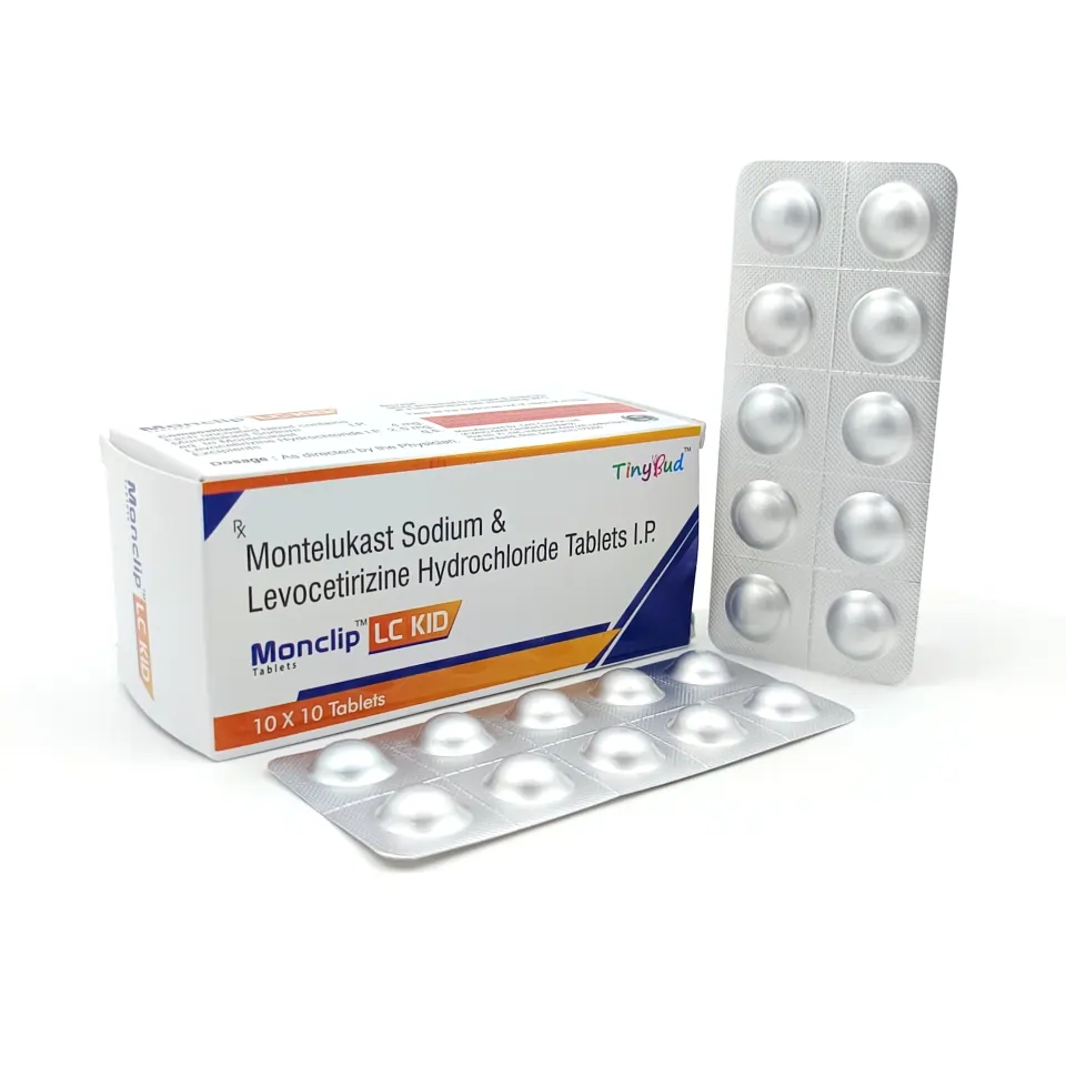 Monclip LC Kid Tablet is a dual-action, bilayered tablet formulated with Levocetirizine (2.5mg) and Montelukast (4mg), specifically designed for children to provide effective relief from allergy symptoms and respiratory issues. This combination is a potent solution for managing both allergic rhinitis and asthma in pediatric patients.