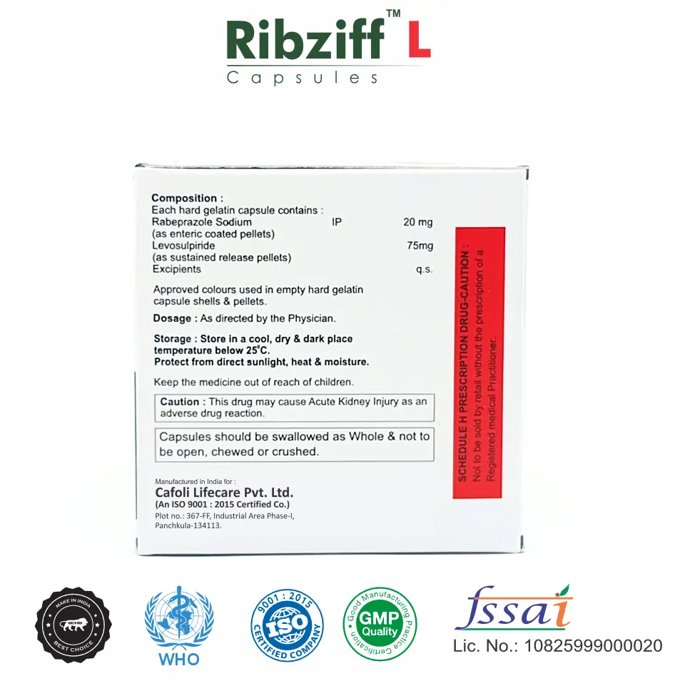 Levosulpiride 75mg + Rabeprazole 20mg capsule is a combination gastrointestinal therapy formulated for the effective management of acid-related disorders associated with impaired gastric motility, ensuring comprehensive symptom control.