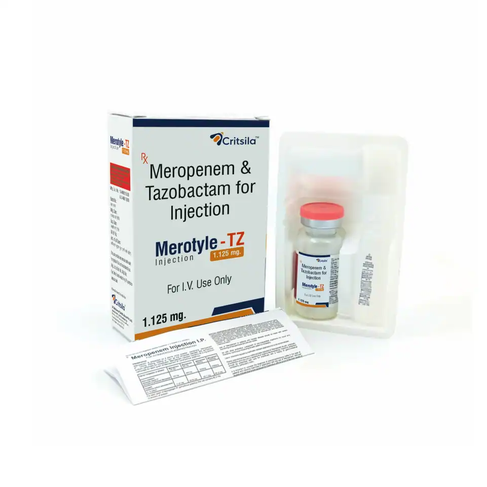 Merotyle TZ Injection is a potent combination of Meropenem (1000mg) and Tazobactam (125mg). Meropenem is a broad-spectrum carbapenem antibiotic that kills bacteria by inhibiting cell wall synthesis, while Tazobactam is a beta-lactamase inhibitor that protects Meropenem from degradation by resistant bacteria. This combination provides enhanced activity against a wide range of multidrug-resistant organisms.