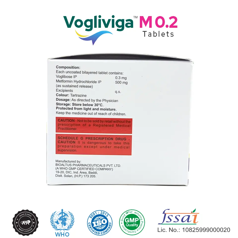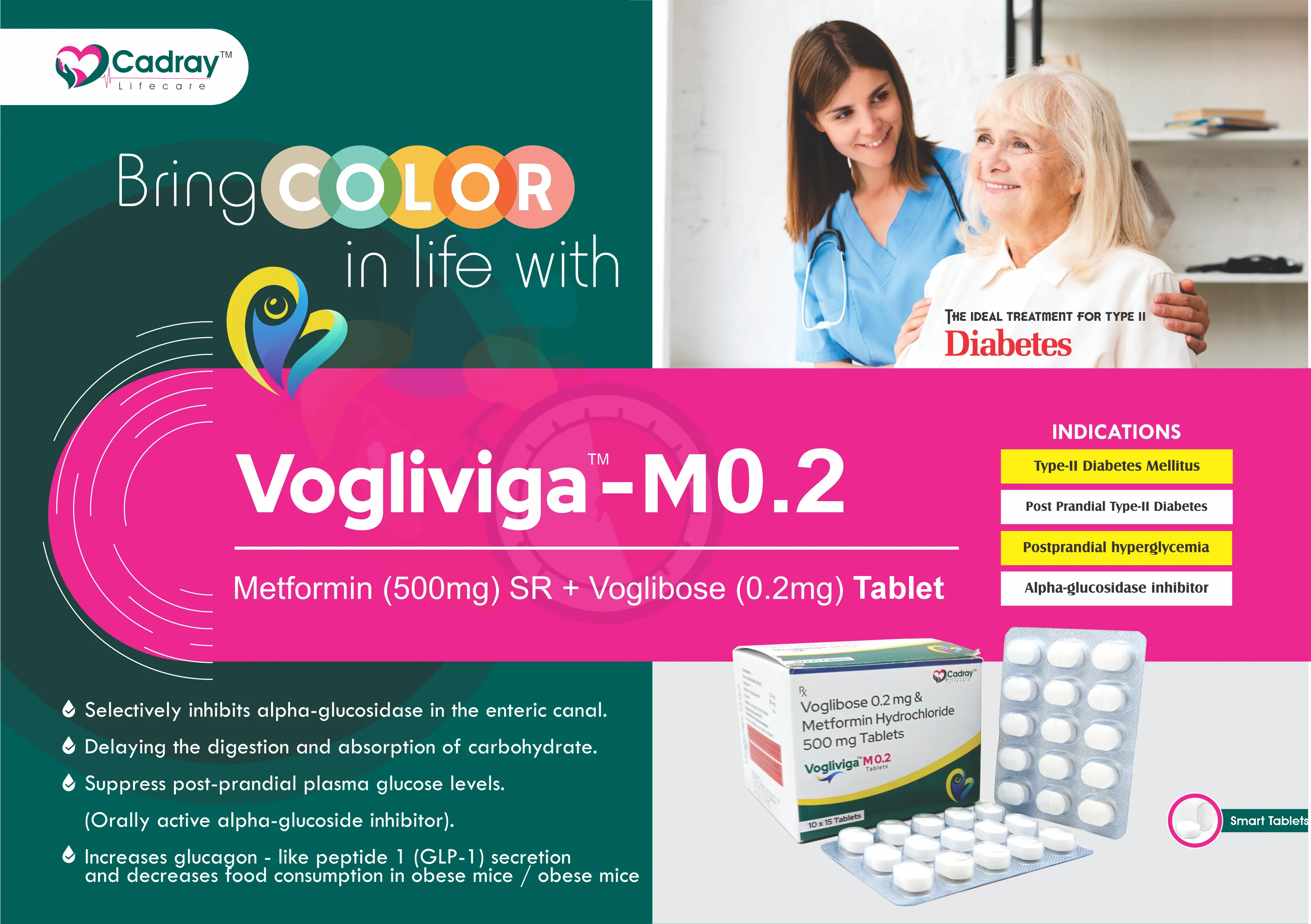 Voglilviga M 0.2 Tablet is a bilayered smart formulation combining Metformin (500mg) in sustained-release (SR) form with Voglibose (0.2mg), designed to offer a dual mechanism for controlling blood glucose levels in patients with Type 2 Diabetes Mellitus. This combination supports improved glycemic control by targeting both fasting and postprandial blood sugar levels.