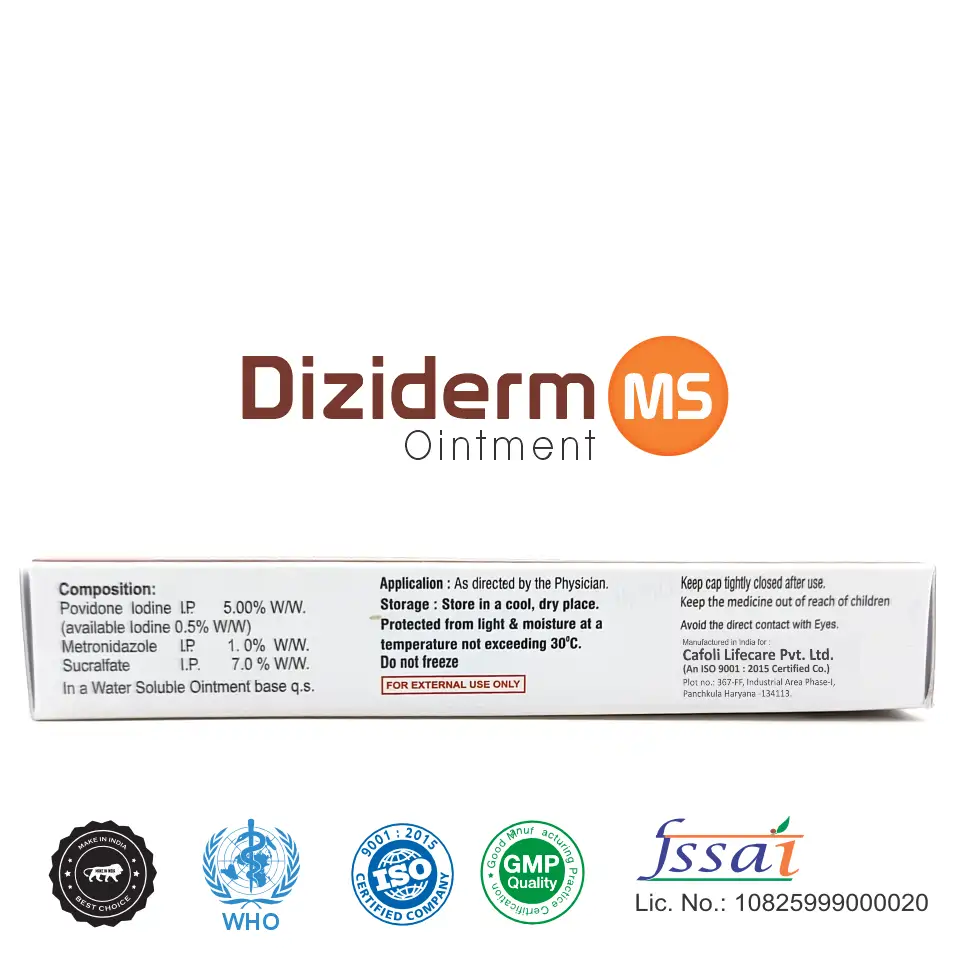Metronidazole helps control anaerobic bacterial infections, while povidone iodine provides broad-spectrum antiseptic action against bacteria, fungi, and viruses. Sucralfate supports tissue regeneration and wound healing by forming a protective barrier over damaged skin.