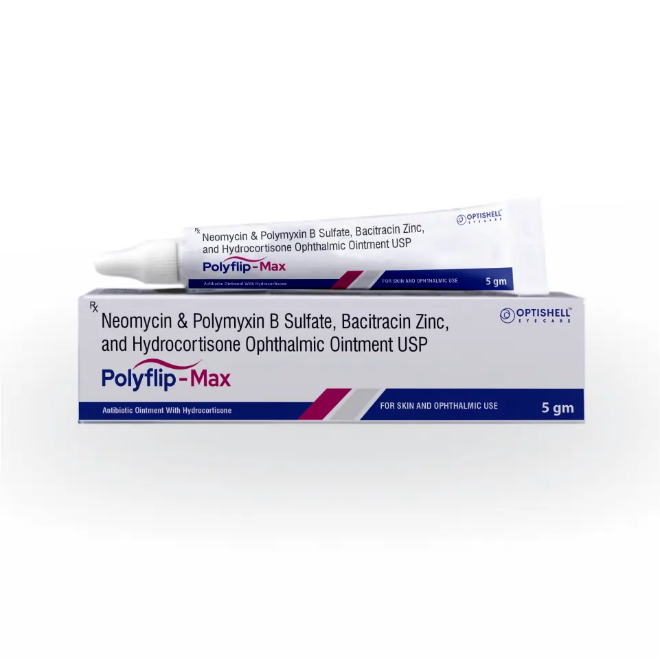 Polyflip Max Eye Ointment contains Neomycin 5000 IU + Polymyxin B 400 IU + Bacitracin Zinc 3400 IU + Hydrocortisone 10 mg, a combination steroid-antibiotic ophthalmic ointment used for bacterial eye infections with associated inflammation.