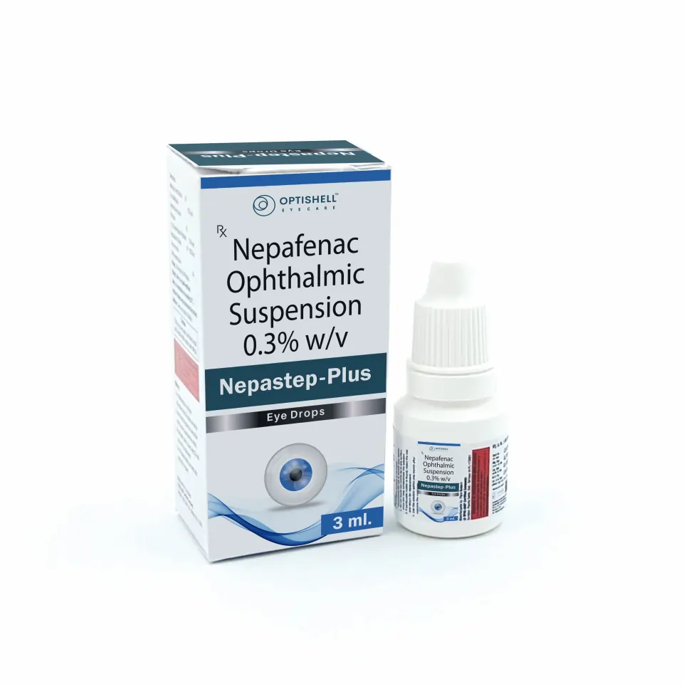 Nepastep Plus Eye Drops are formulated with Nepafenac (0.3% w/v), a clinically proven ophthalmic NSAID. It helps in reducing ocular pain, inflammation, redness, and swelling, especially after cataract surgery and other ophthalmic procedures.
