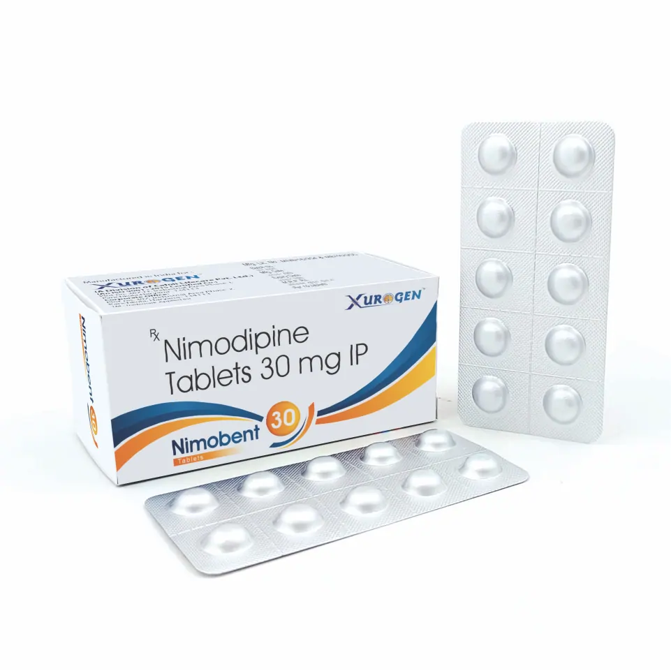 Nimobent 30 Tablet contains Nimodipine 30 mg, a calcium channel blocker primarily used to prevent and treat cerebral vasospasm following subarachnoid hemorrhage. It works by relaxing cerebral blood vessels, improving oxygen and blood flow to the brain, thereby minimizing the risk of ischemic injury.