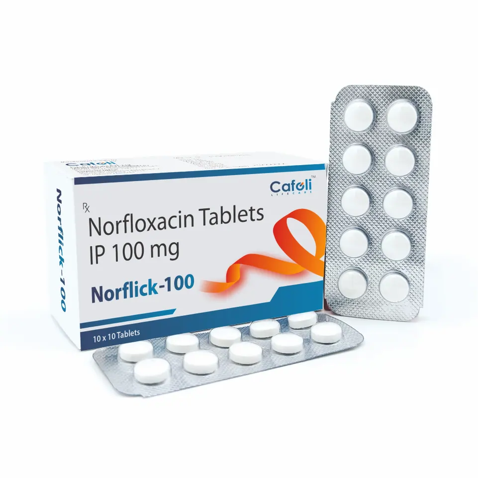Norflick 100 Tablet contains Norfloxacin 100mg, a fluoroquinolone antibacterial indicated for the treatment of urinary tract infections, prostatitis, and other bacterial infections. It helps relieve symptoms such as dysuria, urinary frequency, and discomfort associated with bacterial infections.