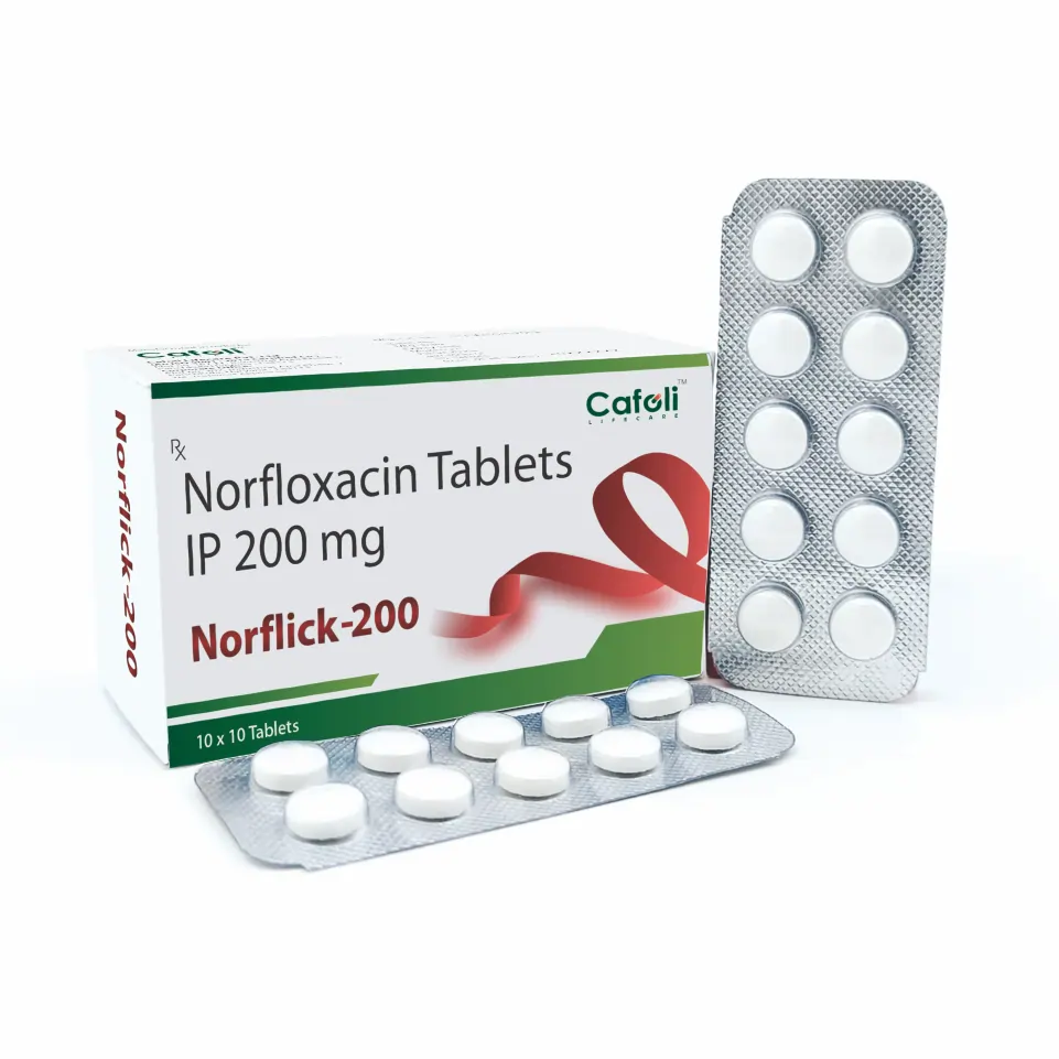Norflick 200 Tablet contains Norfloxacin 200mg, a fluoroquinolone antibacterial indicated for the treatment of urinary tract infections, prostatitis, and other bacterial infections. It helps in relieving symptoms such as dysuria, urinary urgency, and abdominal discomfort caused by bacterial pathogens.