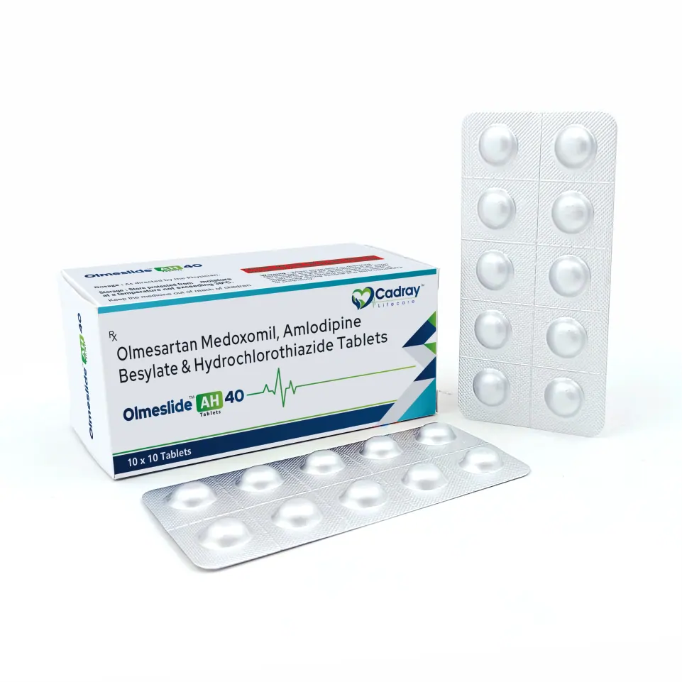 Olmetyle 40 AH Tablet is a fixed-dose combination of Olmesartan Medoxomil 40mg, Amlodipine 5mg, and Hydrochlorothiazide 12.5mg, formulated to effectively manage hypertension in patients requiring multi-drug therapy. Olmesartan is an angiotensin II receptor blocker (ARB) that lowers blood pressure by relaxing blood vessels. Amlodipine, a calcium channel blocker, enhances vasodilation and improves blood flow, while Hydrochlorothiazide is a thiazide diuretic that helps eliminate excess sodium and water, reducing overall blood volume. This triple combination offers a synergistic approach for patients with moderate to severe hypertension, ensuring better blood pressure control and reducing the risk of cardiovascular complications.