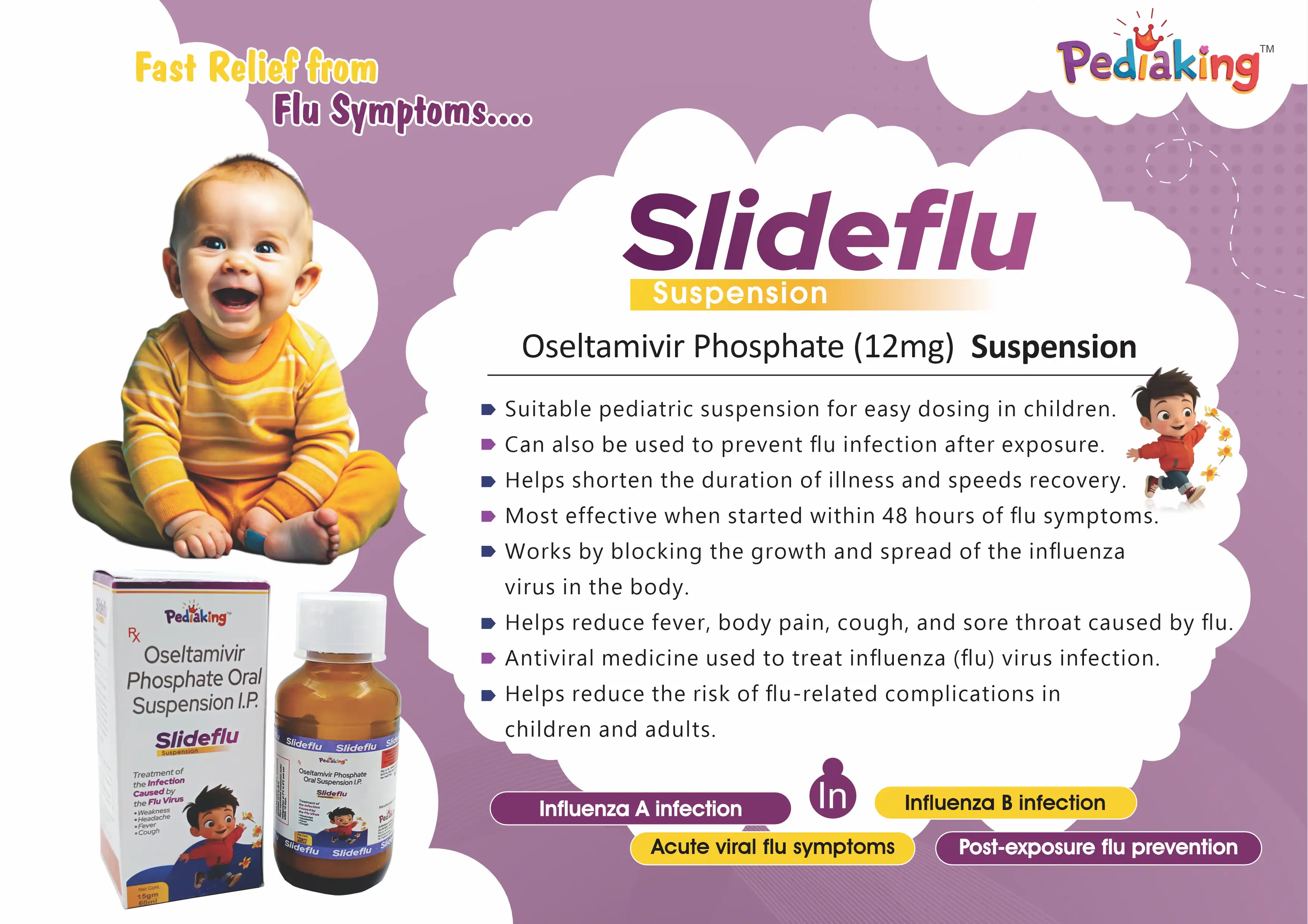 Slideflu Suspension contains Oseltamivir Phosphate 12mg, a clinically proven anti-viral agent for the treatment and prevention of influenza (flu). The syrup form makes it suitable for pediatric and adult patients, ensuring accurate dosing and compliance.