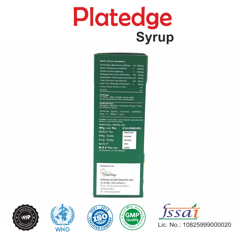 Platedge Herbal Syrup is indicated for supporting platelet count and managing general fever.