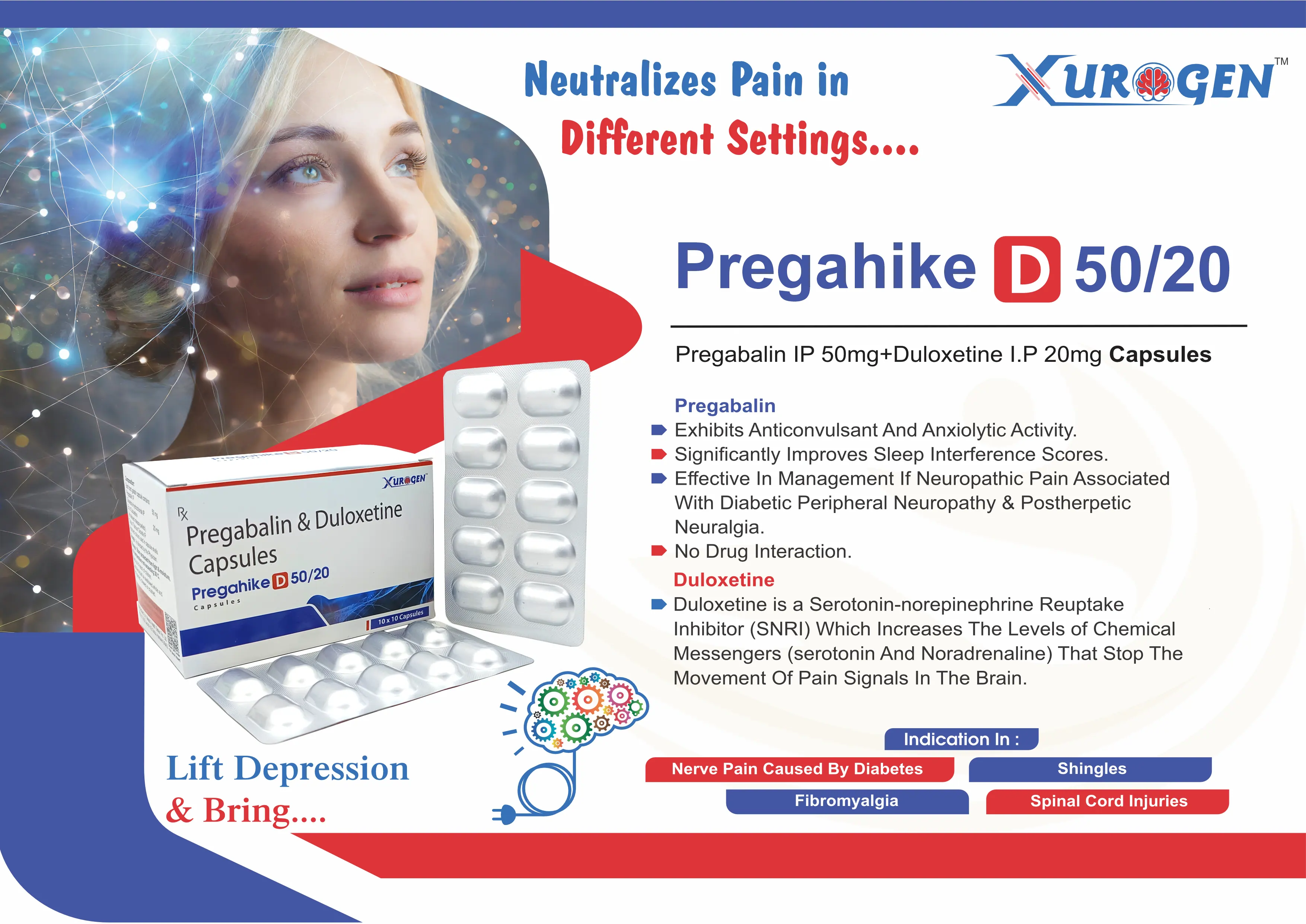 The combination of Pregabalin and Duloxetine in Pregahike D 50/20 Capsule helps to address both the emotional and physical symptoms commonly seen in individuals suffering from anxiety, depression, and chronic pain conditions. This dual-action therapy not only alleviates pain but also improves mental health by stabilizing mood and reducing anxiety, making it an effective option for patients with both chronic pain and mood disorders.