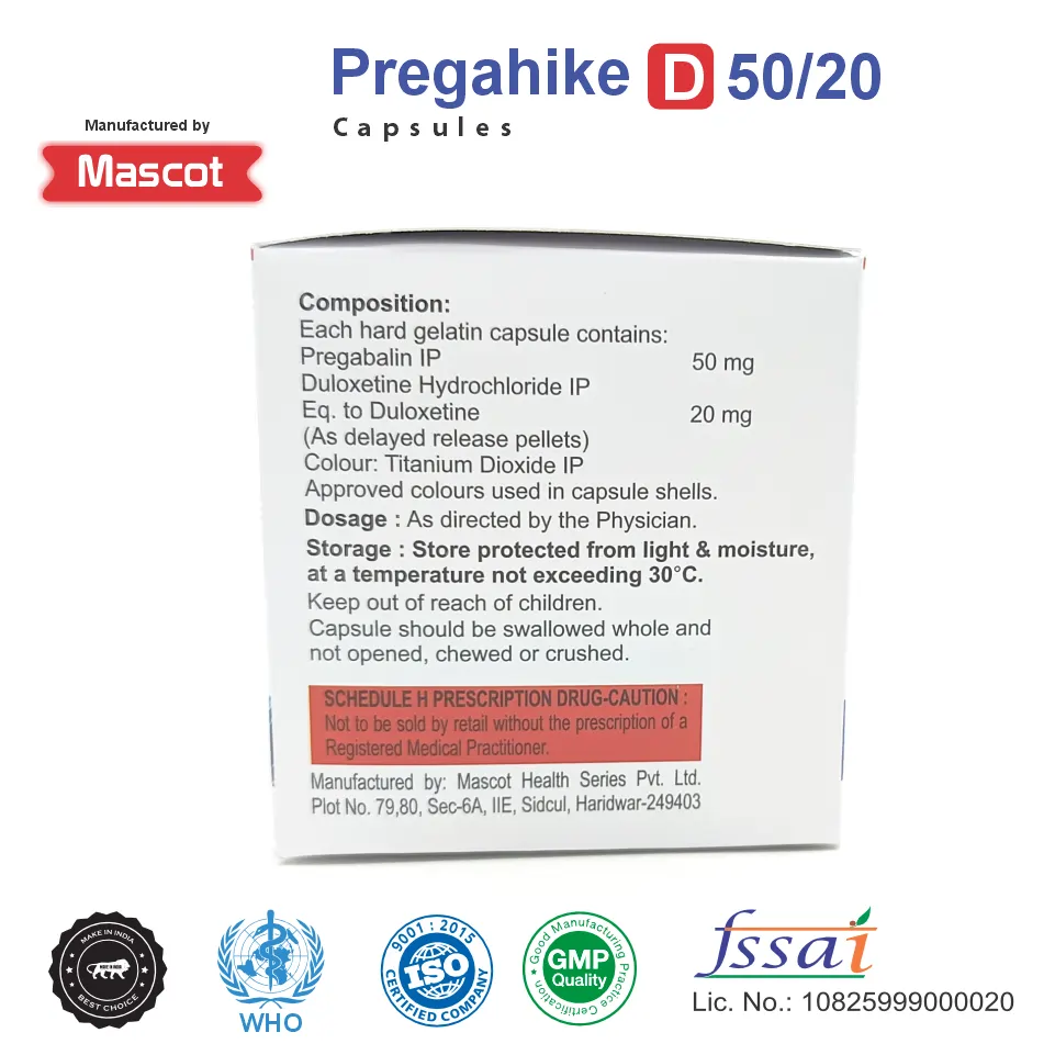 Pregahike D 50/20 Capsule is a combination medication designed to manage and treat various conditions related to neurological and psychiatric health. It combines two active ingredients: Pregabalin and Duloxetine, which work synergistically to provide relief from chronic pain, anxiety disorders, and certain types of depression.