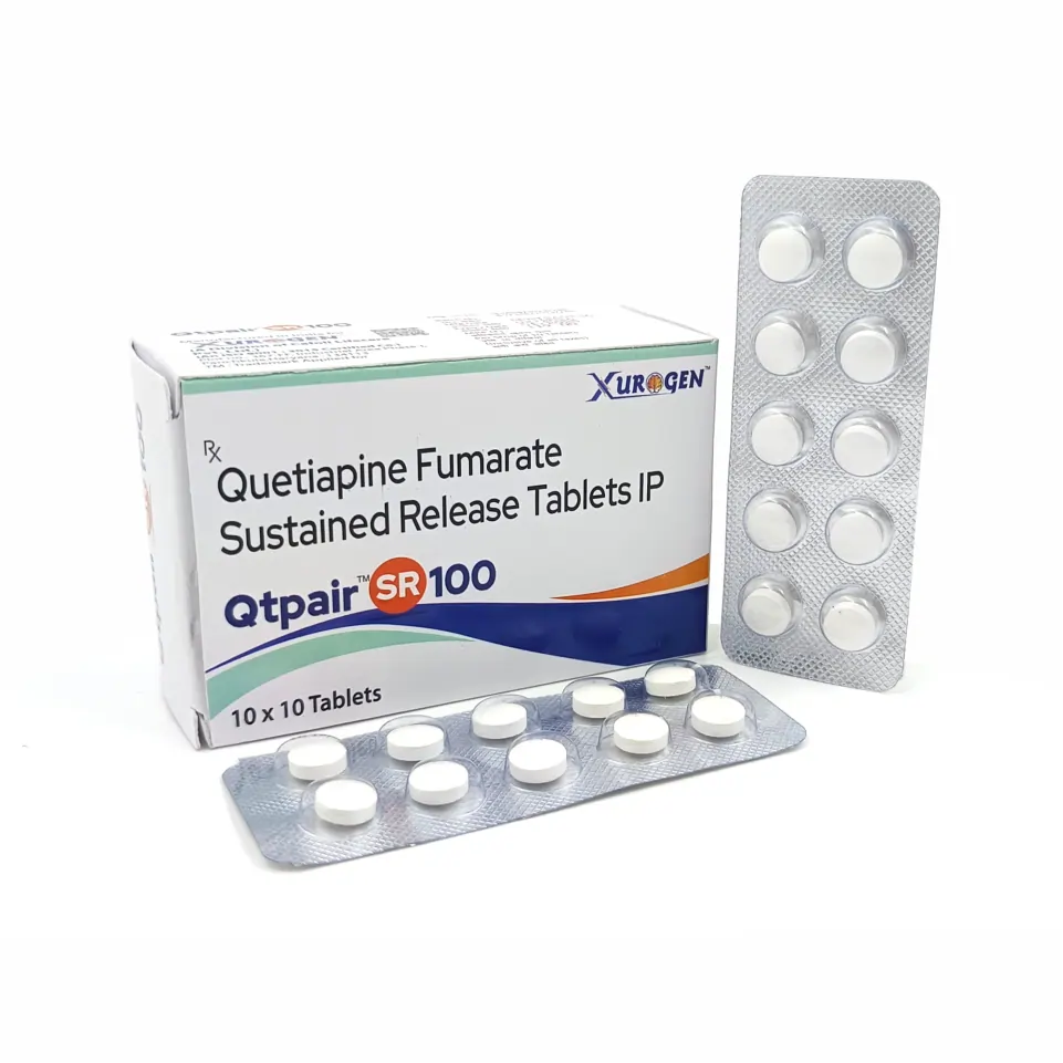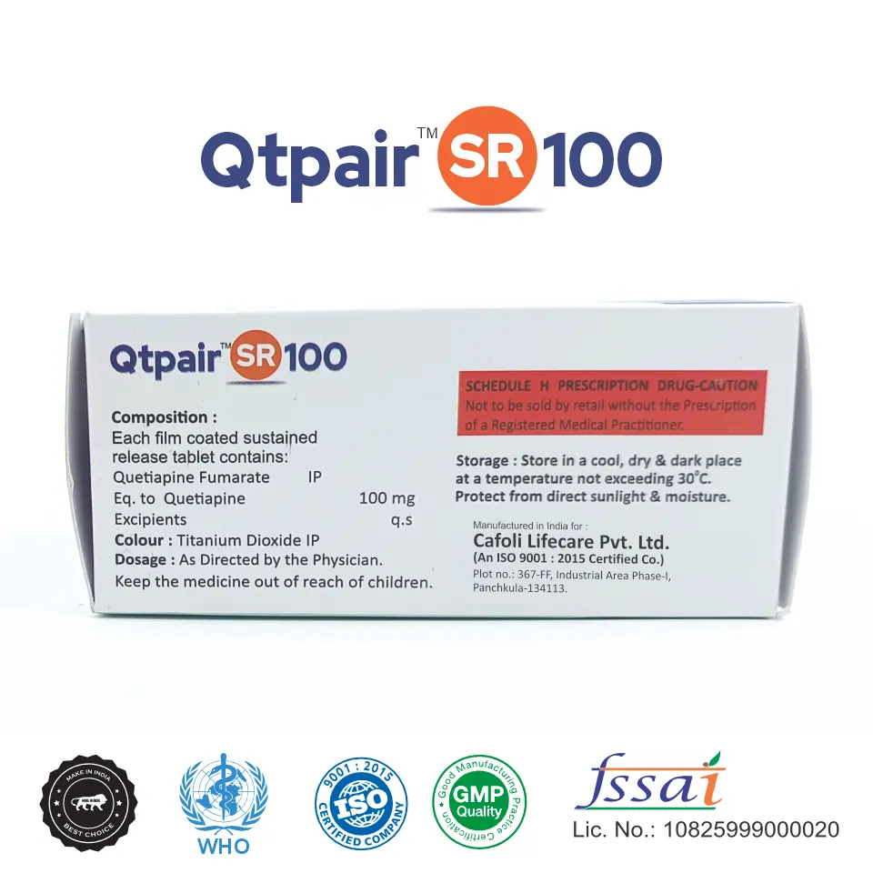 Qtpair 100 Tablet contains Quetiapine Fumarate 100mg, an atypical antipsychotic used in the management of various psychiatric disorders. It is primarily prescribed for schizophrenia, bipolar disorder (manic and depressive episodes), and major depressive disorder (as an adjunct therapy). Quetiapine helps restore the balance of dopamine and serotonin in the brain, leading to improved mood stability, reduced hallucinations, and better cognitive function.
