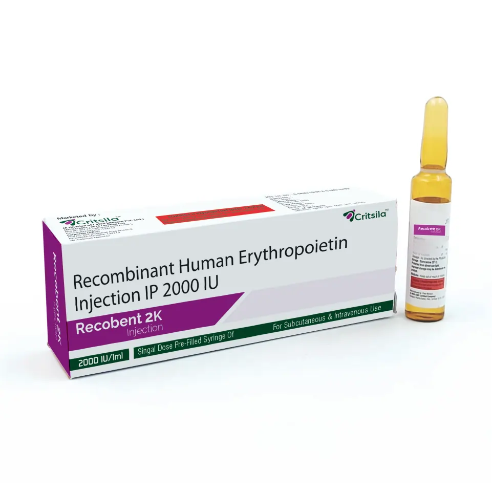 Recobent 2k Injection contains Recombinant Human Erythropoietin Alfa 2000 IU, a biosynthetic erythropoiesis-stimulating agent used for the treatment of anemia related to chronic kidney disease, chemotherapy, and other conditions causing reduced red blood cell production.