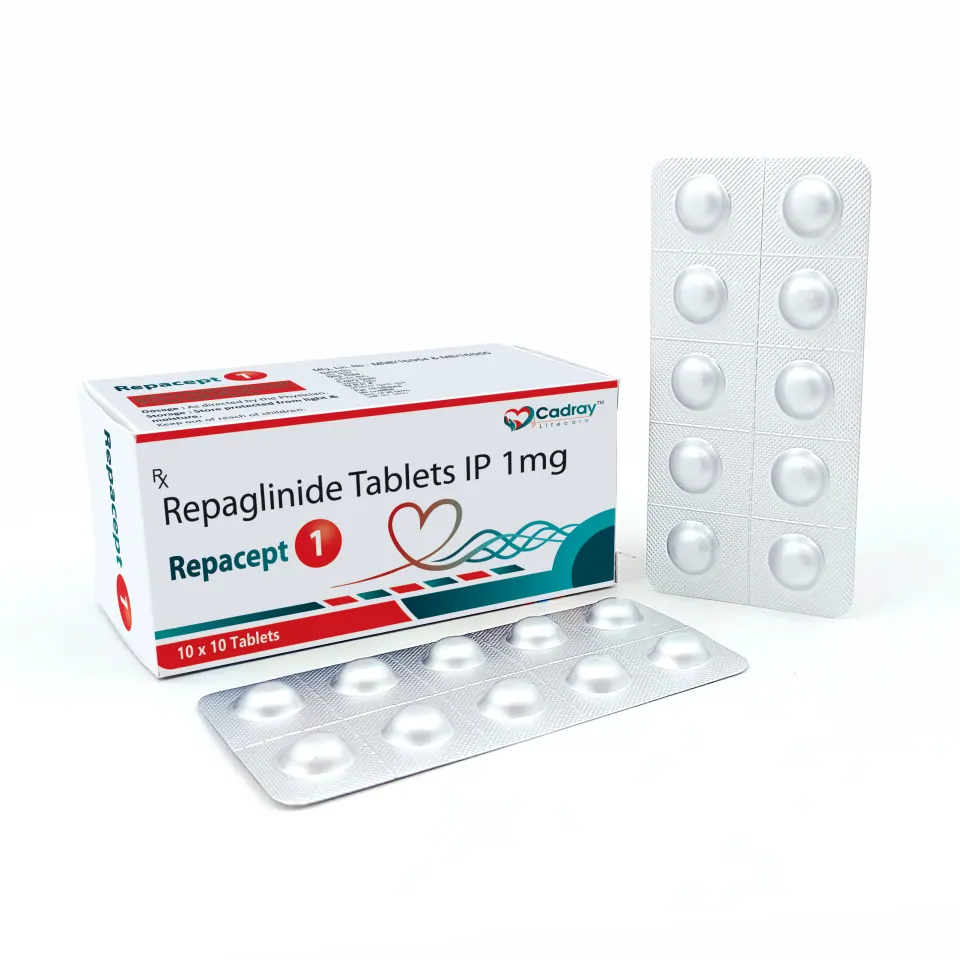 Repacept Tablet contains Repaglinide (1mg), an oral antidiabetic medication that helps regulate postprandial blood glucose levels in patients with type 2 diabetes mellitus. It works by stimulating the pancreas to release insulin, thereby lowering blood sugar after meals.